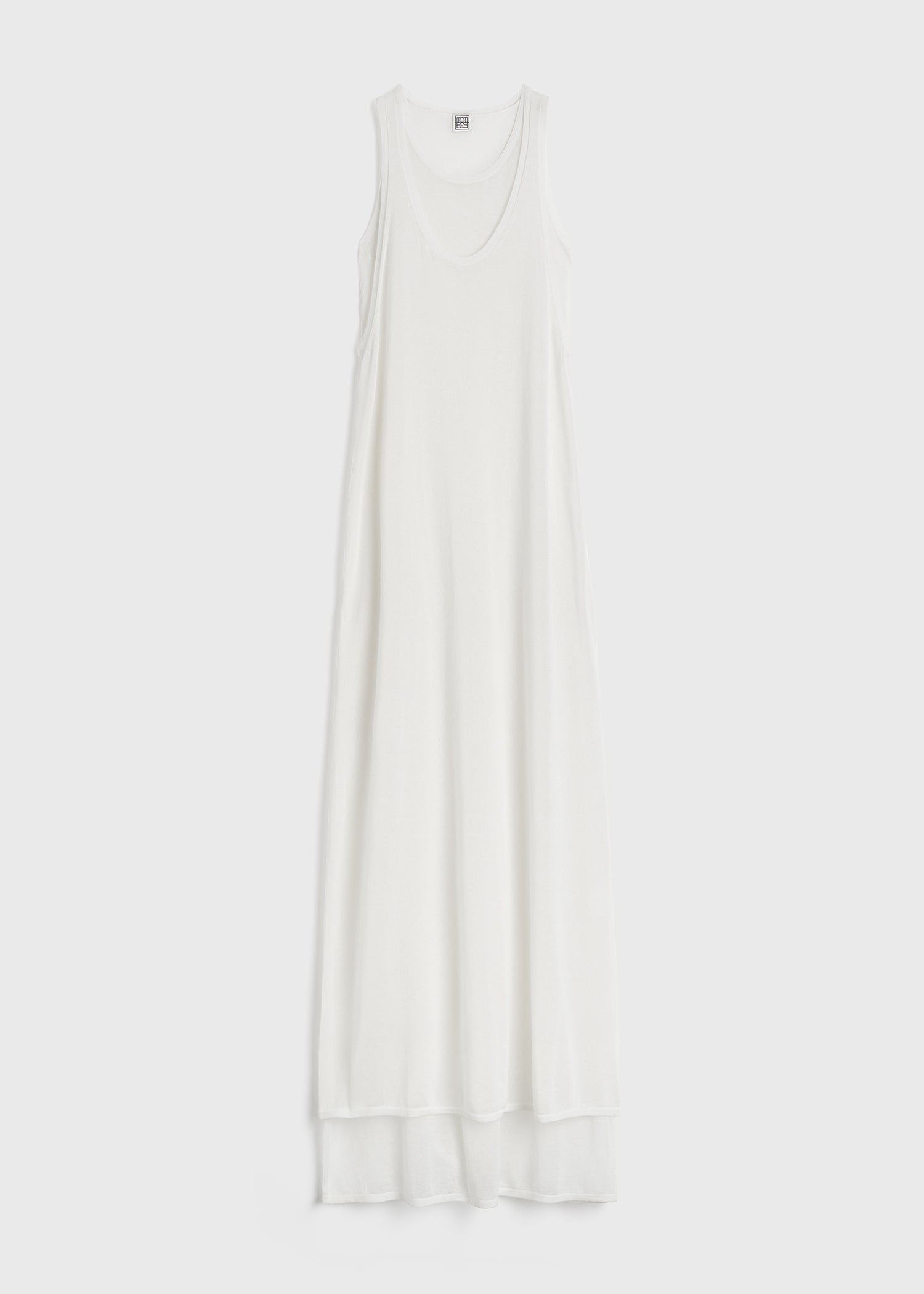Long TOTEME dress layered to create the illusion of two tank dresses in one. It is finely knitted from semi-sheer Lyocell blended with cashmere to a regular-fitting silhouette that drapes to floor-sweeping length. Wear it as an effortless summer piece. Details & Fit - Talc - 89% Lyocell, 10% cashmere, 1% polyamide - Cool hand wash - Style number 243-WRD0128-YA0079 - The model is 176cm/59 tall and wears a size S - True to size