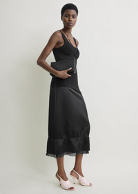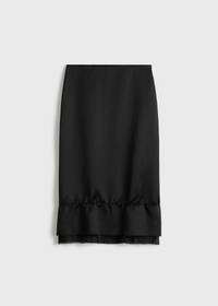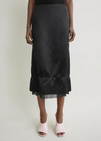 Knee-length skirt cut from heavy satin with a raw edge waist and hem, and visible gauze underlayer for a subtle, sensual undertone. The soft, straight silhouette is finished with a concealed side zip. Details - Black - Concealed side zipper - 81% viscose, 19% linen - Dry clean - Style number 262-WRB0401-FB0623 Fit information - The model is 180cm/5'11” tall and wears a size 36 Origin & Certificates - Made in China - Manufacturer: Weisi Garment (Shenzhen) Co., Ltd - Material woven in China; dyed in China