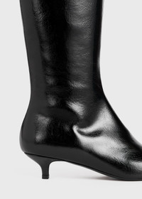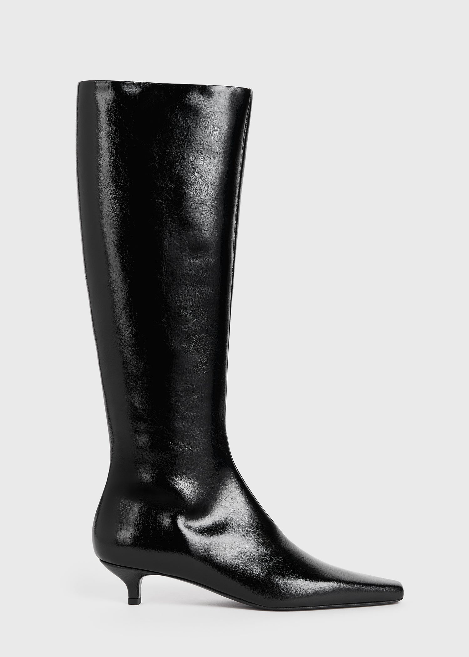 A new knee-length addition to TOTEME's boot offering, stitched up with a neatly paneled upper and set on a 35mm kitten heel. They're crafted in Italy from lightly crinkled patent leather with a foot-wrapping fit that's possible thanks to a handy side zipper. Let them peep below dresses and skirts. Details & Fit - Black - Side zipper - Black leather lining - Leather sole - 100% Cow leather; lining: 100% sheep leather; sole: 100% cow leather - Care instructions and dust bag included - Style number 234-WLGSE064-LE0014 - Average heel height 3.5cm/1.4"; top edge circumference 37.5cm/14.7"; leg height 40cm/16.1" proportional to shoe size - True to size, slim fit