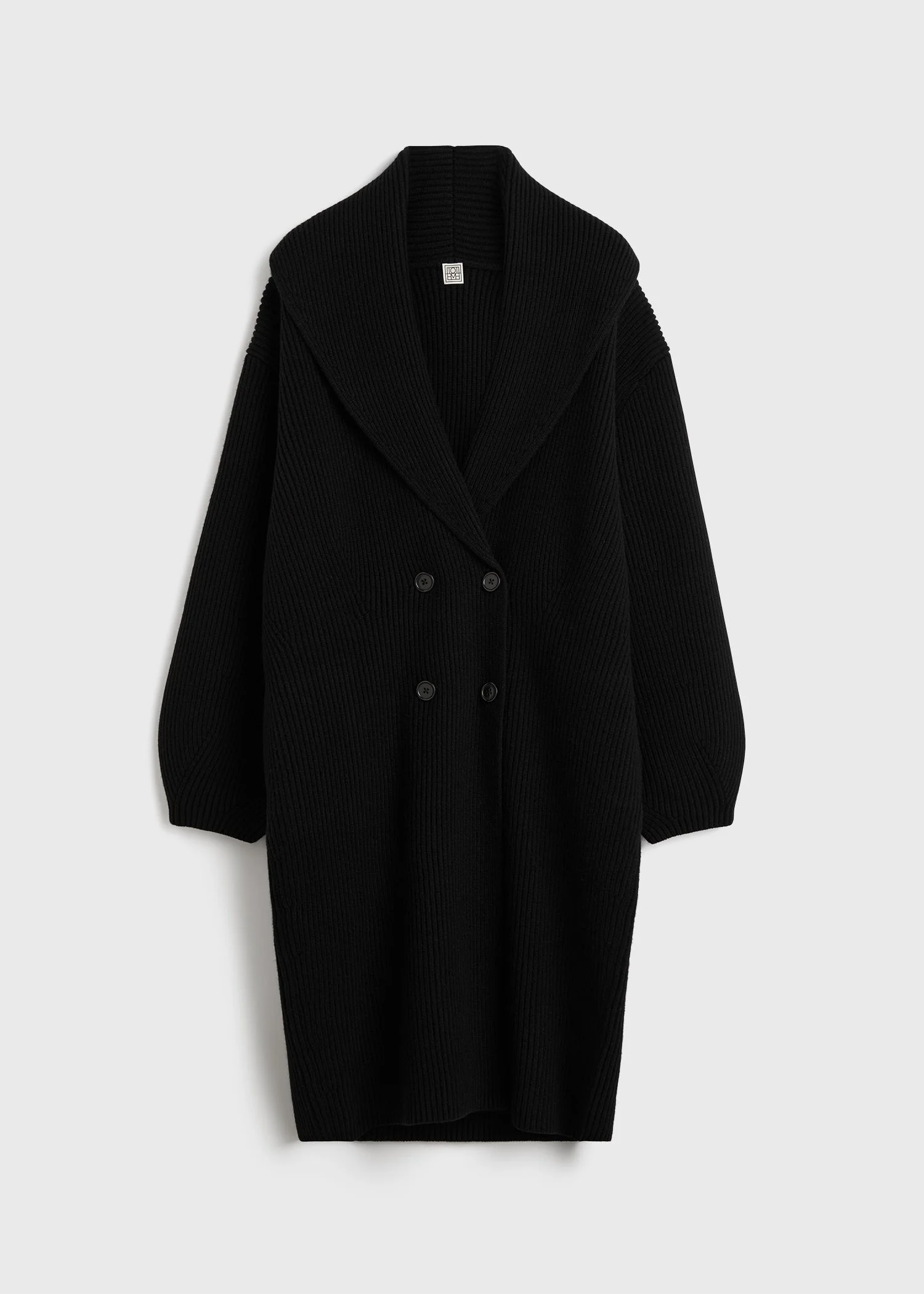 A longer iteration of the Shawl-lapel cardigan echoing the double-breasted construction of a traditional peacoat, with generous curved sleeves. Details - Black - Double-breasted button front - Side-seam pockets - 94% RWS Wool, 6% Polyamide - Cool hand wash - Style number 261-WRT0698-YA0239 Fit information - The model is 180cm/5'11” tall and wears a size S - Oversized fit, low armholes Origin & Certificates - Country of origin: China - Main supplier: Hangzhuo Springair Ace Textile Co. Ltd