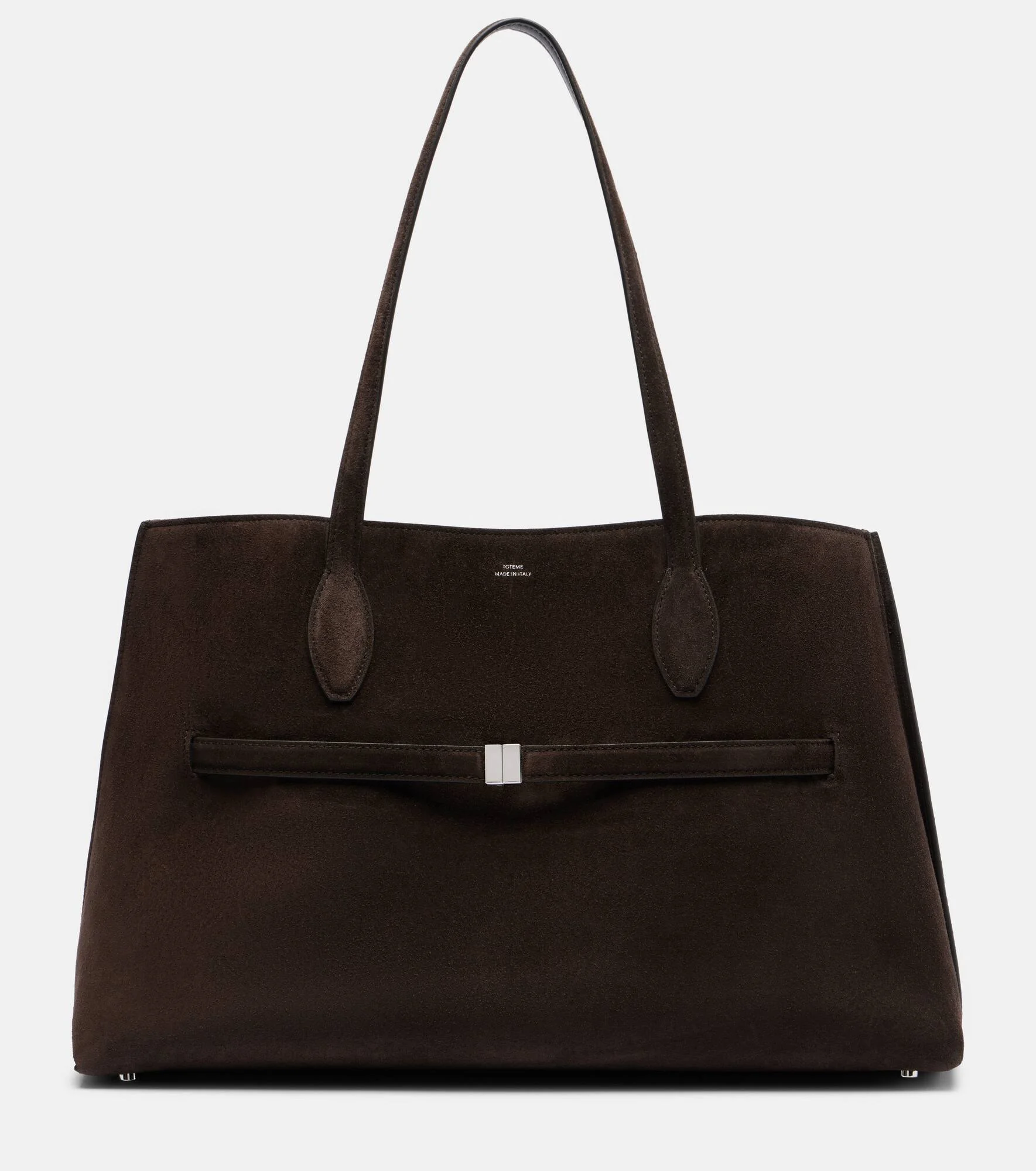 Define your dress code with styles from Toteme, a Stockholm-based brand dedicated to creating a modern uniform. Made in Italy from brown suede, the Lounge tote bag is a structured piece with protective feet on its bottom. Product Details - Material: leather (suede) - Lining: leather - Made in Italy - Designer color name: Brown - Item color: brown - Closure: lobster-clasp fastening - Top handles - Internal details: internal slot pockets - Hardware color: silver - Includes: dust bag - Item number: P01093294 Size & Fit - Height 28cm-11" - Width 44cm-17.5" - Depth 14cm-5.5" - Length of handles 61cm-24"