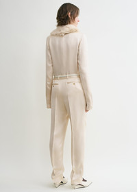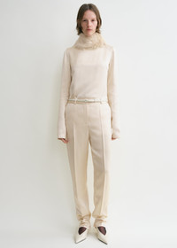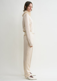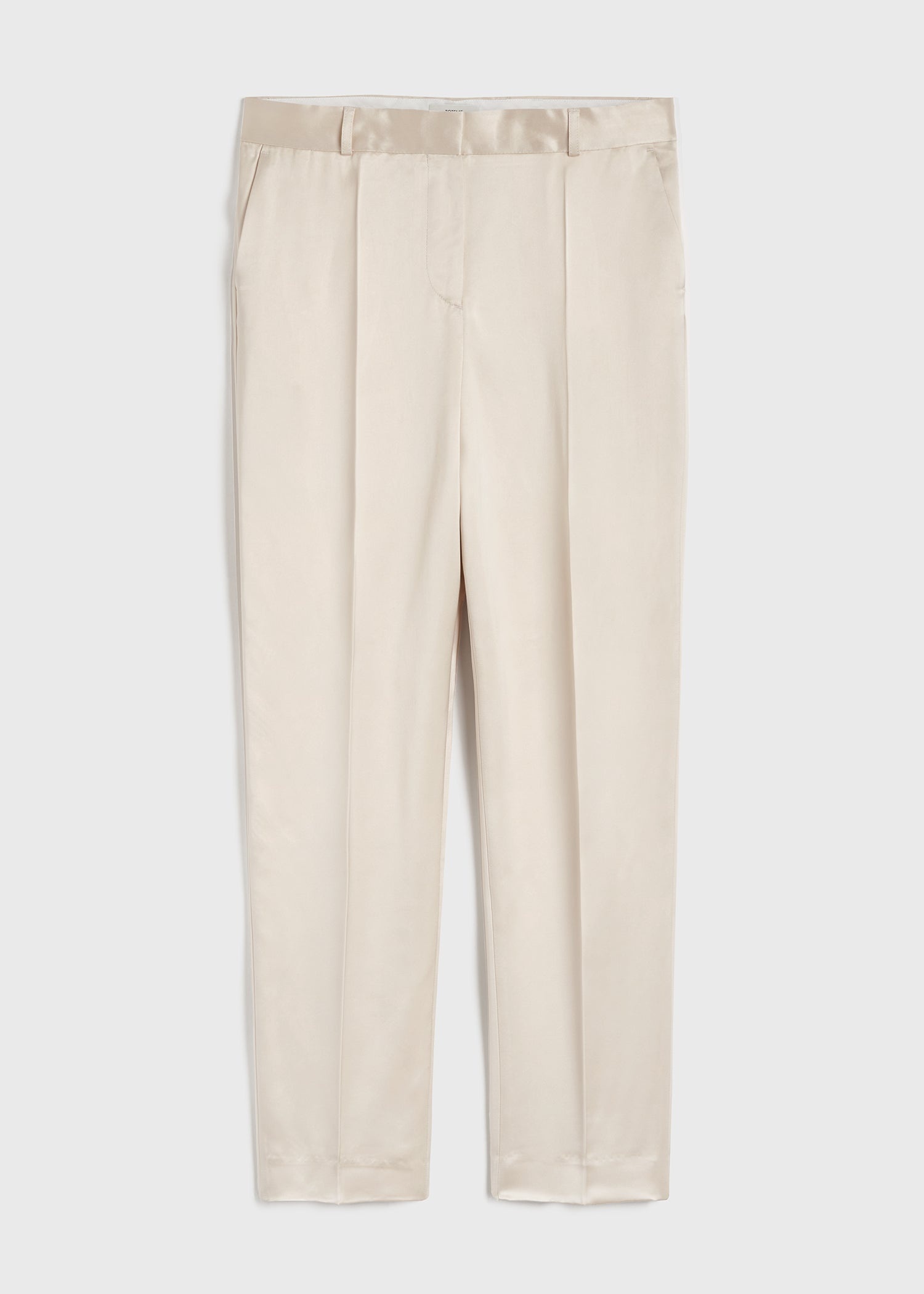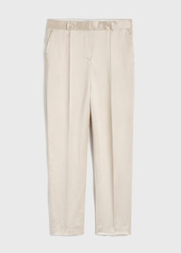 TOTEME trousers cut to a modern cigarette silhouette with a low waistline and slim, tapered legs. They are constructed from fluid double-weave satin and are fitted with belt loops, side and back pockets and a zipper fly. Add the matching top for an evening look. Details & Fit - Ecru - Belt loops - Side and back pockets - Hook and zipper fly - 100% viscose - 30°C machine wash - Style number 244-WRB0228-FB0208 - The model is 178cm/510 tall and wears a size 36 - True to size