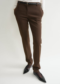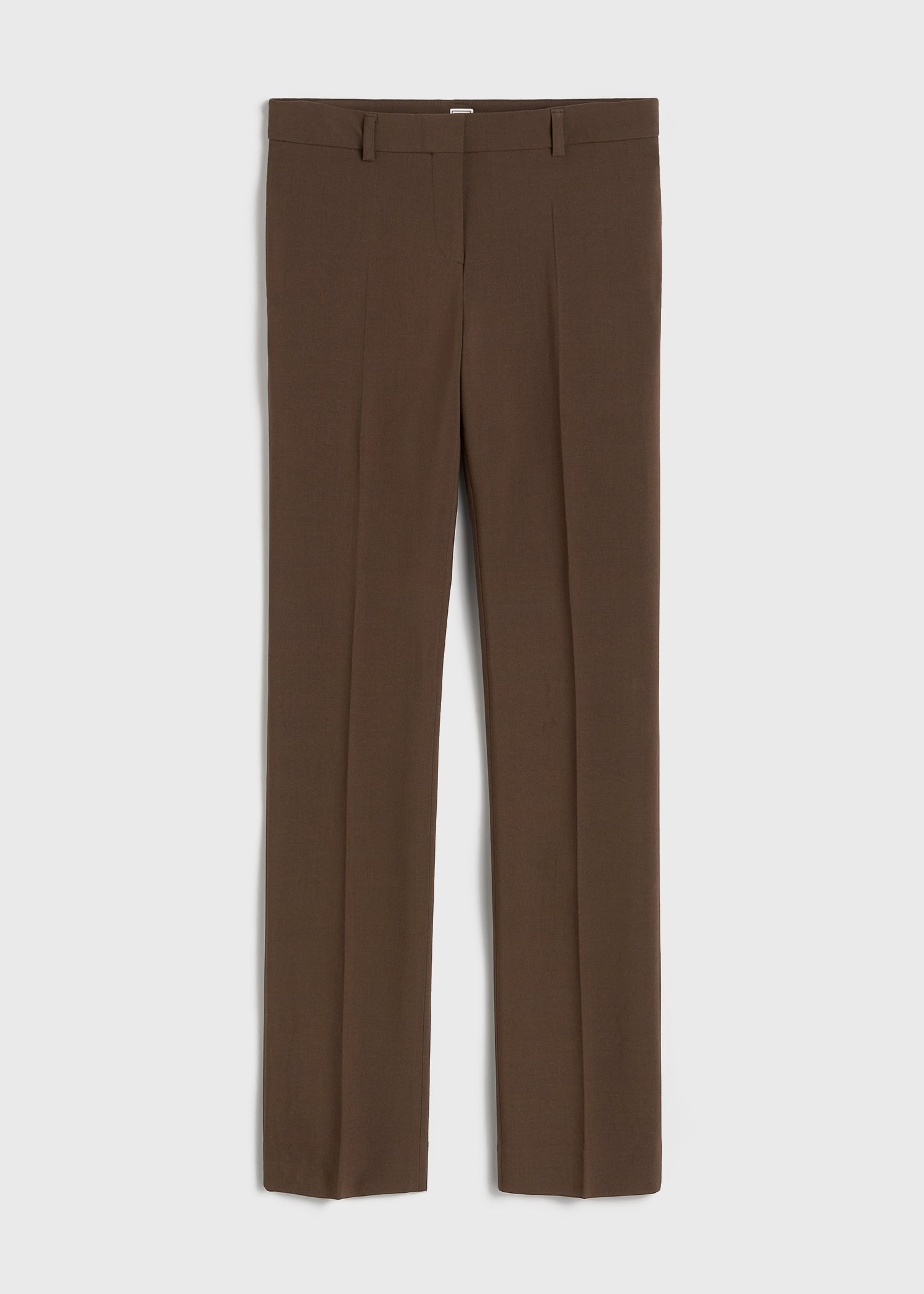 TOTEME trousers cut to a modern cigarette silhouette with a low waistline and slim, tapered legs. They are constructed from a spongy tailoring fabric with belt loops, side and back pockets and a zipper fly. Complete the suit with the matching blazer. Details & Fit - Bark - Belt loops - Side and back pockets - Zipper fly - 53% polyamide recycled, 43% wool RWS, 4% elastane - Dry clean - Style number 244-WRB0220-FB0061 - The model is 180cm/5'11 tall and wears a size 36 - True to size, low waist and slim legs