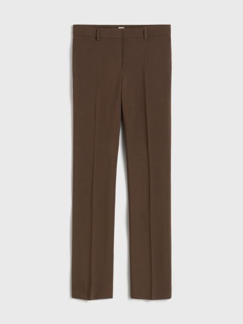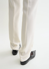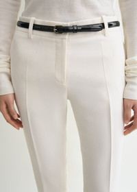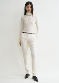 TOTEME trousers cut to a modern cigarette silhouette with a low waistline and slim, tapered legs. Made from a comfortable mix of recycled polyamide and certified wool fibres blended with a touch of elastane, they feature belt loops, side and back pockets and a zipper fly. Accentuate body-hugging silhouette with a slim top. Details & Fit - Ecru - Belt loops - Side and back pockets - Zipper fly - 60% acetate, 40% polyester - Dry clean - Style number 244-WRB0220-FB0296 - The model is 180cm/5'11 tall and wears a size 36 - True to size, low waist and slim legs