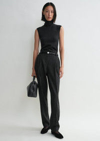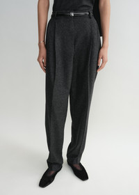 These suit trousers are a new expression of TOTEME's distinctive tailoring codes. They are made from light melange flannel with a low, hip-hugging waistband and straight legs that have pockets and double pleats running seamlessly down the front. Team it with a grey top as part of a polished mid-week edit. Details & Fit - Charcoal - Belt loops - Side and back pockets - Zipper fly - 70% wool recycled, 25% polyamide, 5% other fibers - Dry clean - Style number 251-WRB847-FB0024 - Fits large and are meant to sit on the hips, if you want them to sit at the waist go down a size - The model is 180cm/5'11 tall and wears a size 36