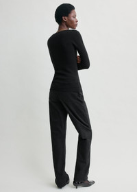 Elevated merino wool blend top with an alluring scoop neckline and second-skin silhouette that can be easily dressed up and down. Details & Fit - Black - 88% RWS wool, 12% polyamide - Cool hand wash - Style number 254-WRT0571-YA0128 - The model is 180cm/5'11 tall and wears a size S - Slim torso and arms, stretchy material