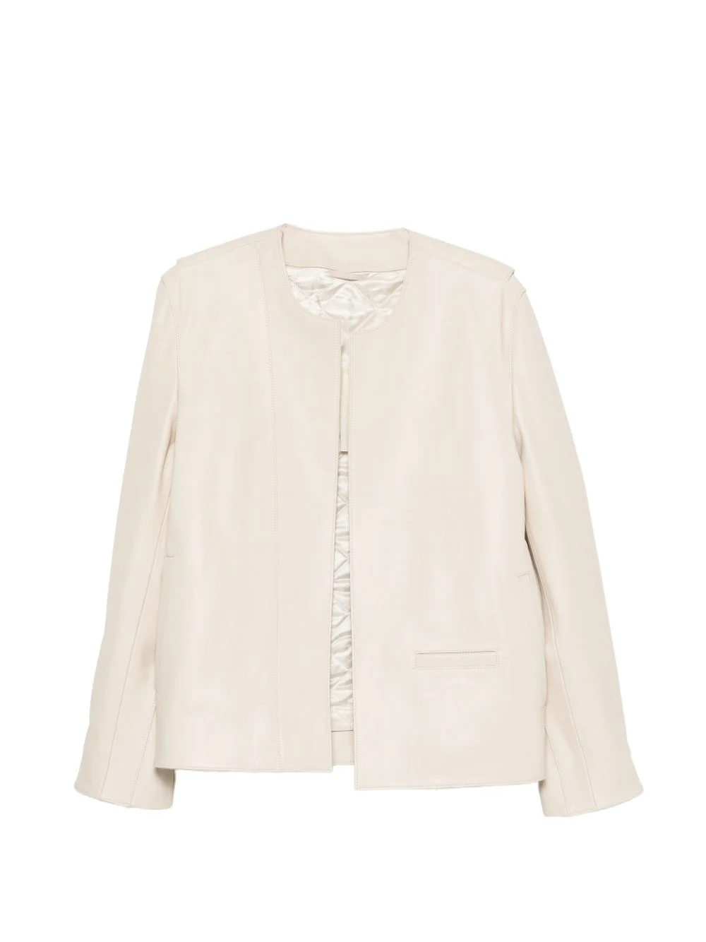 minimal biker jacket Highlights - Beige - Panelled design - Zip fastening - Chest welt pocket - Round neck Imported Composition Outer: Calf Leather 100% Lining: Viscose 100% Washing instructions Read Manufacturer Guidelines