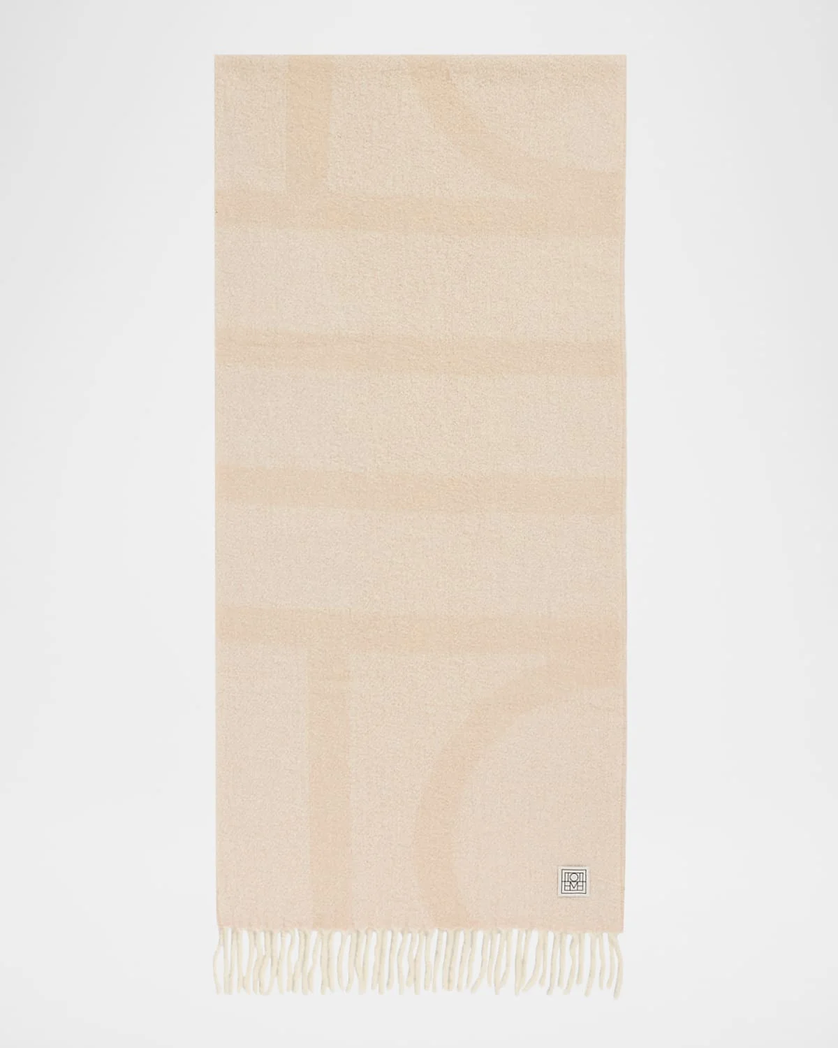 Crafted from cozy boucle, this Toteme scarf elevates winter looks with a tonal monogram jacquard pattern. Approx. 86.6"L x 20"W May be styled multiple ways Alpaca/polyester Hand wash Made in Italy