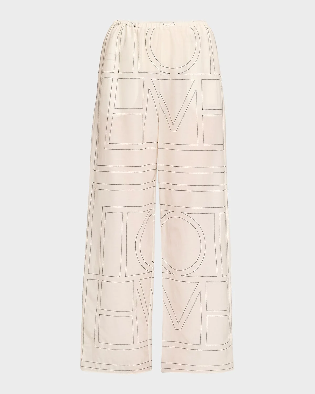 Toteme trousers & nbsp;topstitched with the brand & apos;s contrasting distinctive monogram & nbsp; Elasticated drawstring waistband & nbsp; Side seam pockets Cropped at the ankle Relaxed fit Straight legs Pull-on style & nbsp; Organic cotton/lyocell Imported