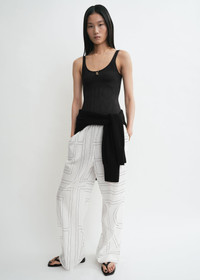 TOTEME trousers topstitched in black with our distinctive monogram. They are woven from organic cotton and Lyocell to a relaxed, straight-leg silhouette inspired by classic pajamas and are finished with an elasticated waistband and side pockets. Wear them during a coastal vacation with the matching shirt. Details & Fit - White/black - Black monogram topstitch; the position of the pattern may differ from the pictures - Elasticated waistband - Side pockets - 50% organic cotton, 50% Lyocell - Dry clean - Style number 243-WRB1092-FB0239 - The model is 176cm/59 tall and wears a size 36 - True to size