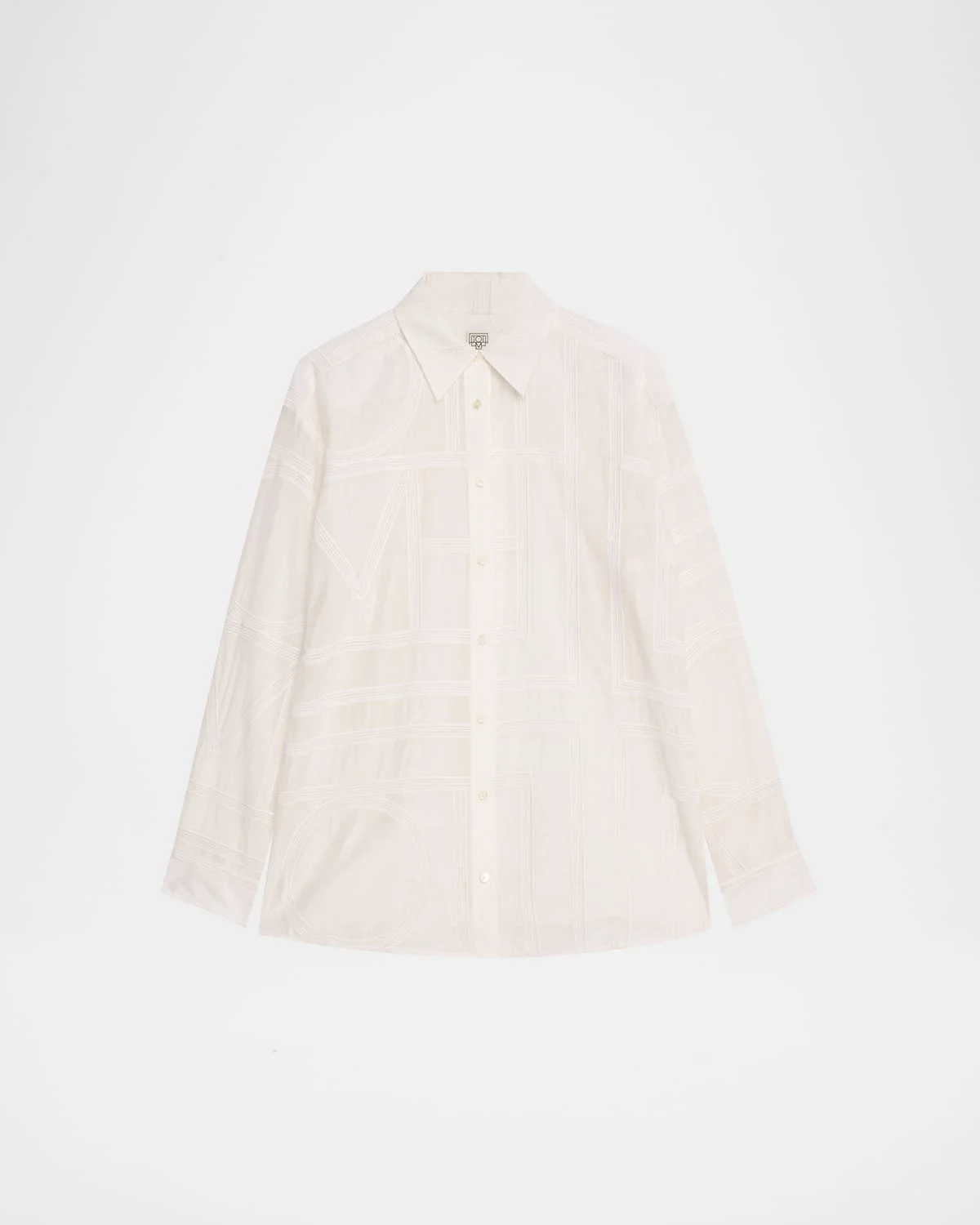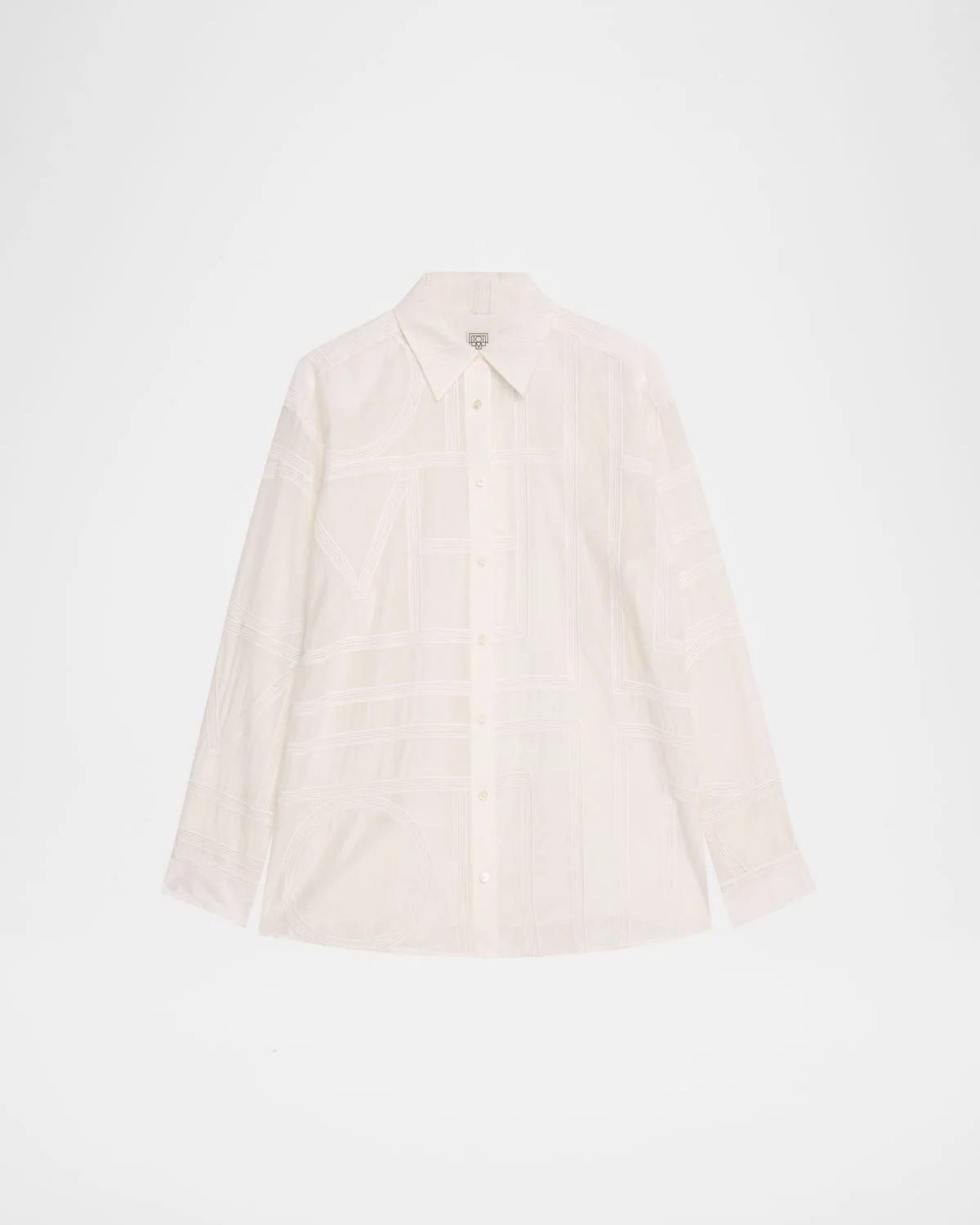 - Toteme classic coton voile shirt animated with a crochet-inspired embroidery of the toteme monogram - Point collar; button front - Long sleeves; button cuffs - Drop shoulders - Yoked back; box pleat - Oversized fit - Organic cotton/silk - Dry clean - Imported