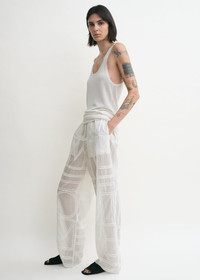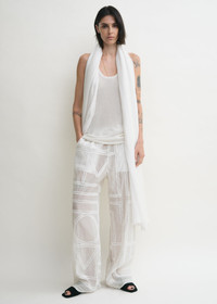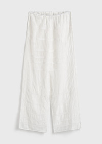 Summer pj bottoms reworked in a light cotton-silk blend accented with a crochet rendition of the TOTEME monogram. They are suspended from an elasticated waistband and have convenient side pockets. Style them with a simple tee or complete the set with the matching shirt. Details & Fit - White - Elasticated waistband - Side pockets - Light, semi-sheer fabric - 65% cotton organic, 35% silk - Dry clean - Style number 253-WRB0316-FB0441 - The model is 181cm/511 tall and wears a size 36 - True to size