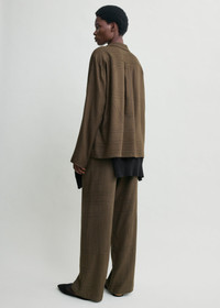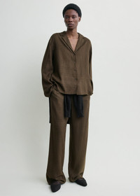 Our emblematic pj top made from lightweight modal flannel embroidered with a fine monogram pattern. The relaxed silhouette features a lapel collar, spacious long sleeves and mother-of-pearl buttons. Wear it all day with the Monogram flannel pj bottoms. Details & Fit - Dark brown - Monogram topstitching; the position of the pattern may differ from the pictures - Button front - 100% Lenzing TENCEL modal - Dry cleaning or cool hand wash recommended - Style number 261-WRT0805-FB0080 - The model is 180cm/5'11 tall and wears a size 36 - Oversized fit, go down a size if you prefer a neater look