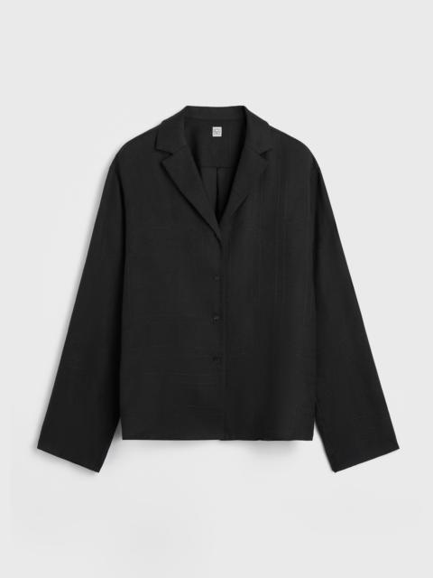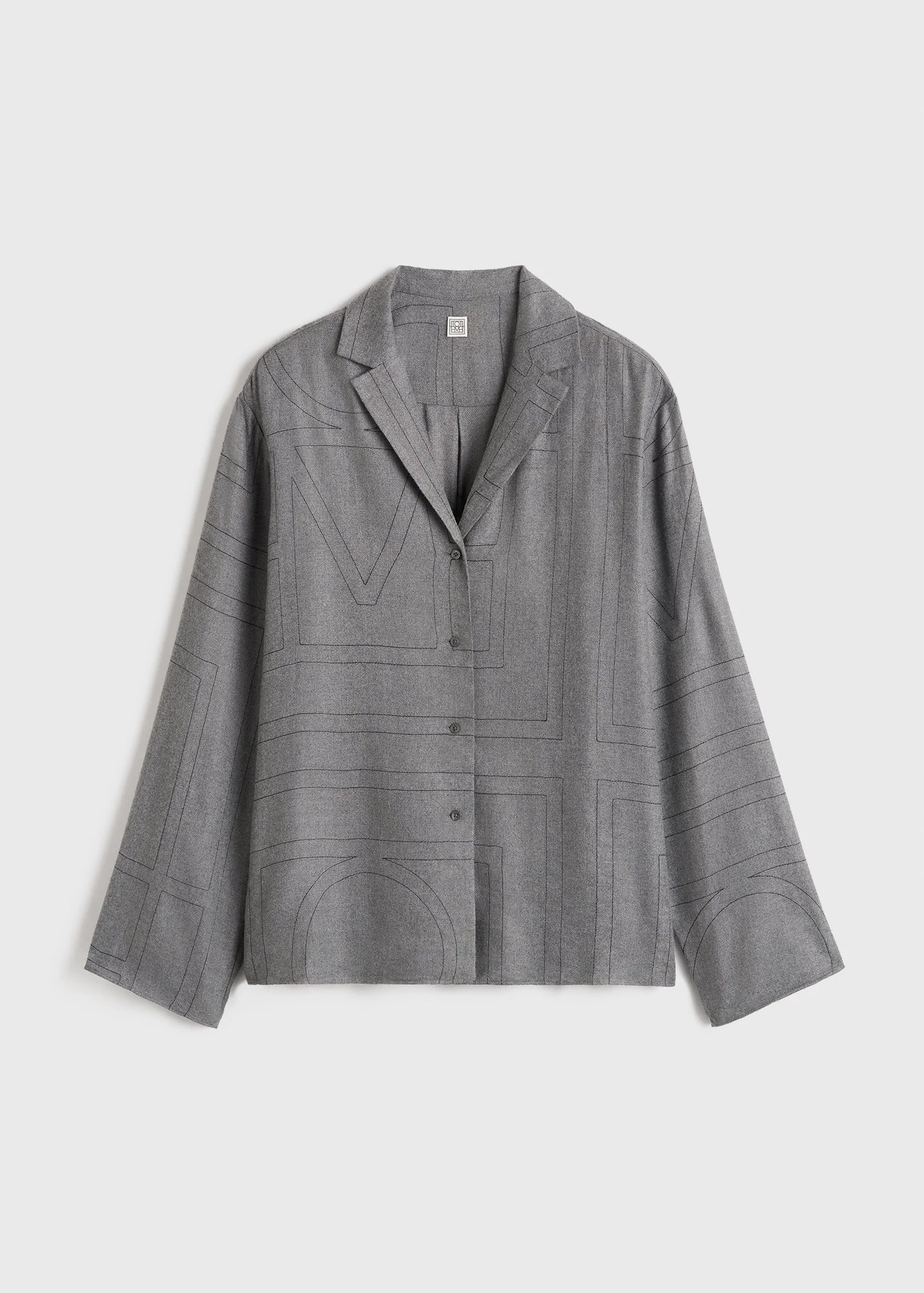 TOTEME pj top made from lightweight modal flannel embroidered with a fine monogram pattern in contrasting thread. It is shaped to a relaxed silhouette with a lapel collar and spacious long sleeves and fastens with mother-of-pearl buttons. Wear it all day with the Monogram flannel pj bottoms. Details & Fit - Smoke - Ivory monogram topstitching; the position of the pattern may differ from the pictures - Button front - 100% modal - Dry cleaning or cool hand wash recommended - Style number 251-WRT976-FB0080 - Relaxed fit, true to size - The model is 178cm/510 tall and wears a size 36