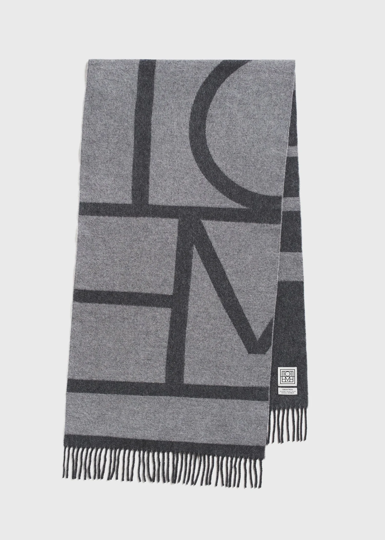 TOTEME scarf featuring a tonal monogram jacquard with a negative reverse and fringed edges. It's woven in Italy from wool certified by the Responsible Wool Standard and measures 220x50cm. Wear it throughout winter over your favorite coat or jacket. Details & Fit - Dark grey melange - The position of the monogram pattern may differ from the pictures - 100% Wool - Dry clean - Style number 224-882-807 - Length 220cm/87 - Width 50cm/20