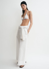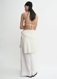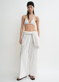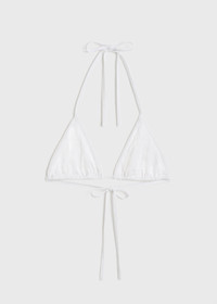 Designer's note: "For the TOTEME Garderob curation, we revisited our monogram swimwear through a feminine and sensual lens, echoing our affinity for transparency. This triangle bikini top is crafted from ribbed jersey with a drop-stitch monogram mimicking a delicate pointelle knit and has a minimalist silhouette with adjustable straps. Wear it as a set with the matching bottoms." Details & Fit - White - Adjustable neck and back ties - Lightweight, ribbed fabric - Pointelle-effect drop-stitch monogram - Sheer mesh lining - 95% polyamide recycled, 5% elastane - 30°C delicate machine wash - Style number 253-WSW1028-FB0452 - The model is 180cm/511 tall and wears a size S - True to size