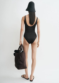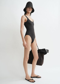 Designer's note: "For the TOTEME Garderob curation, we revisited our monogram swimwear through a feminine and sensual lens, echoing our affinity for transparency. This swimsuit is crafted from ribbed jersey with a drop-stitch monogram mimicking a delicate pointelle knit and has a classic silhouette with a scooped back. Team it with a hat and flip flops." Details & Fit - Black - Lightweight, ribbed fabric - Pointelle-effect drop-stitch monogram - Sheer mesh lining - 95% polyamide recycled, 5% elastane - 30°C delicate machine wash - Style number 253-WSW1149-FB0452 - The model is 180cm/511 tall and wears a size S - True to size