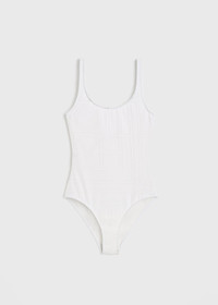 Designer's note: "For the TOTEME Garderob curation, we revisited our monogram swimwear through a feminine and sensual lens, echoing our affinity for transparency. This swimsuit is crafted from ribbed jersey with a drop-stitch monogram mimicking a delicate pointelle knit and has a classic silhouette with a scooped back. Team it with a hat and flip flops." Details & Fit - White - Lightweight, ribbed fabric - Pointelle-effect drop-stitch monogram - Sheer mesh lining - 95% polyamide recycled, 5% elastane - 30°C delicate machine wash - Style number 253-WSW1149-FB0452 - The model is 180cm/511 tall and wears a size S - True to size