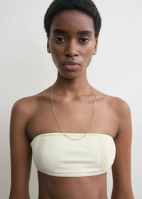 Minimalist bikini top printed with a new ecru/straw rendition of the TOTEME monogram pattern. It is made from fully lined stretch jersey to a strapless bandeau silhouette supported with an internal silicone trim. Wear it with the coordinating bikini bottoms or mix and match. Details & Fit - Ecru/straw - The position of the monogram pattern may differ from the pictures - Ecru and straw monogram print - Full lining, silicone edge - 43% polyamide recycled, 29% polyamide, 28% elastane - 30°C machine wash - Style number 252-WSW1041-FB0221 - The model is 178cm/510 tall and wears a size S - True to size