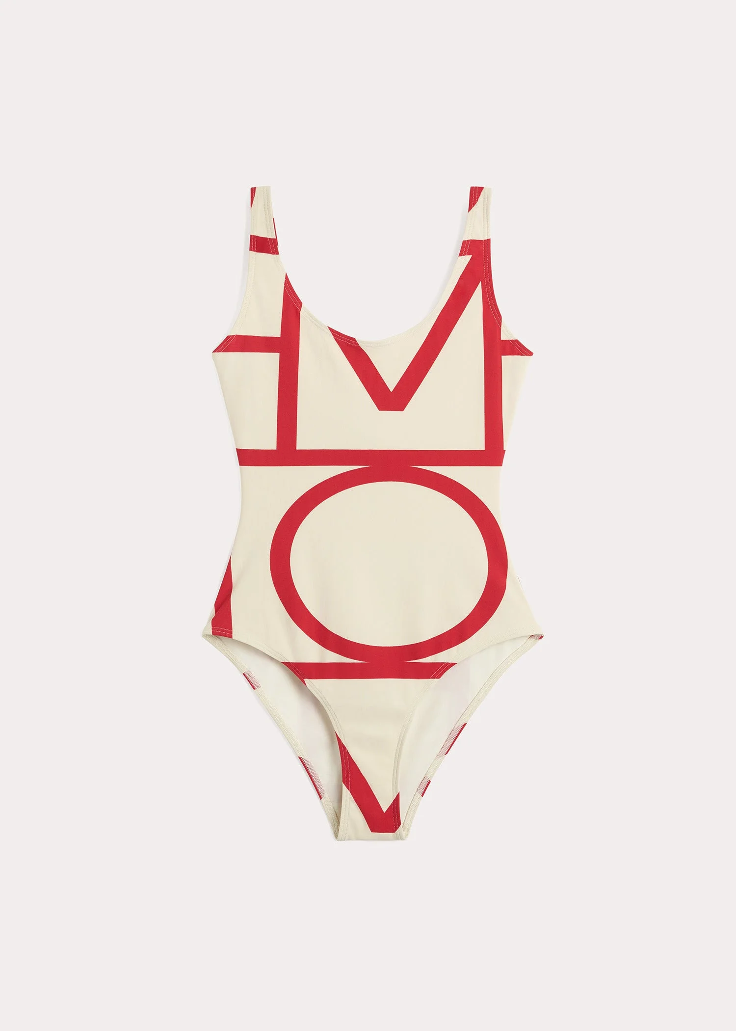 This swimsuit is printed with TOTEME's signature monogram pattern in cava beige and red. It's made in Portugal from four way-stretch, recycled-polyamide jersey which protects against sun rays, and is shaped to a classic silhouette with a deep U-back and high-cut legs. Pack it with the Monogram jacquard beach towel for your next vacation. Details & Fit - Cava/red - The position of the monogram pattern may differ from the pictures - 73% Recycled polyamide, 27% elastane - 30°C Machine wash - Style number 222-842-795 - The model is 180cm/59 tall and wears a size S - True to size if you have a longer torso, consider taking a size up