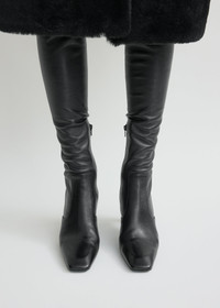 Over-the-knee boots featured throughout the Fall Winter 25 collection and crafted from stretch Nappa leather for a contoured, second-skin fit. Made in Italy, they fasten with a short zipper and are on a bar-shaped set-back heel measuring 85mm. Keep them in focus below fluid dresses and skirts. Details & Fit - Black - Soft Nappa leather, stretch neoprene lining - Leather insole and sole - Side zipper - 100% lamb leather; lining: 100% sheep leather; sole: 100% cow leather - Care instructions and dust bag included - Style number 254-WAS0262-LE0193 - Average heel height 85mm/3.3" proportional to shoe size - True to size