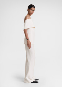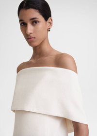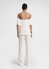 TOTEME evening top defined with an arched off-the-shoulder neckline that hugs the arms and dips at the back. It has a slim crepe silhouette supported with an internal zipped structure that has anti-slip silicone edges for an impeccable fit. Complete a festive look with trousers and pumps. Details & Fit - Macadamia - Internal structure with zipper and silicone edges - White lining - Back zipper - 70% Viscose, 30% virgin wool; lining: 100% polyester - Dry clean - Style number 241-WRT997-FB0068 - The model is 179cm/5'10" tall and wears a size 36 - Slim fit, snug around the chest