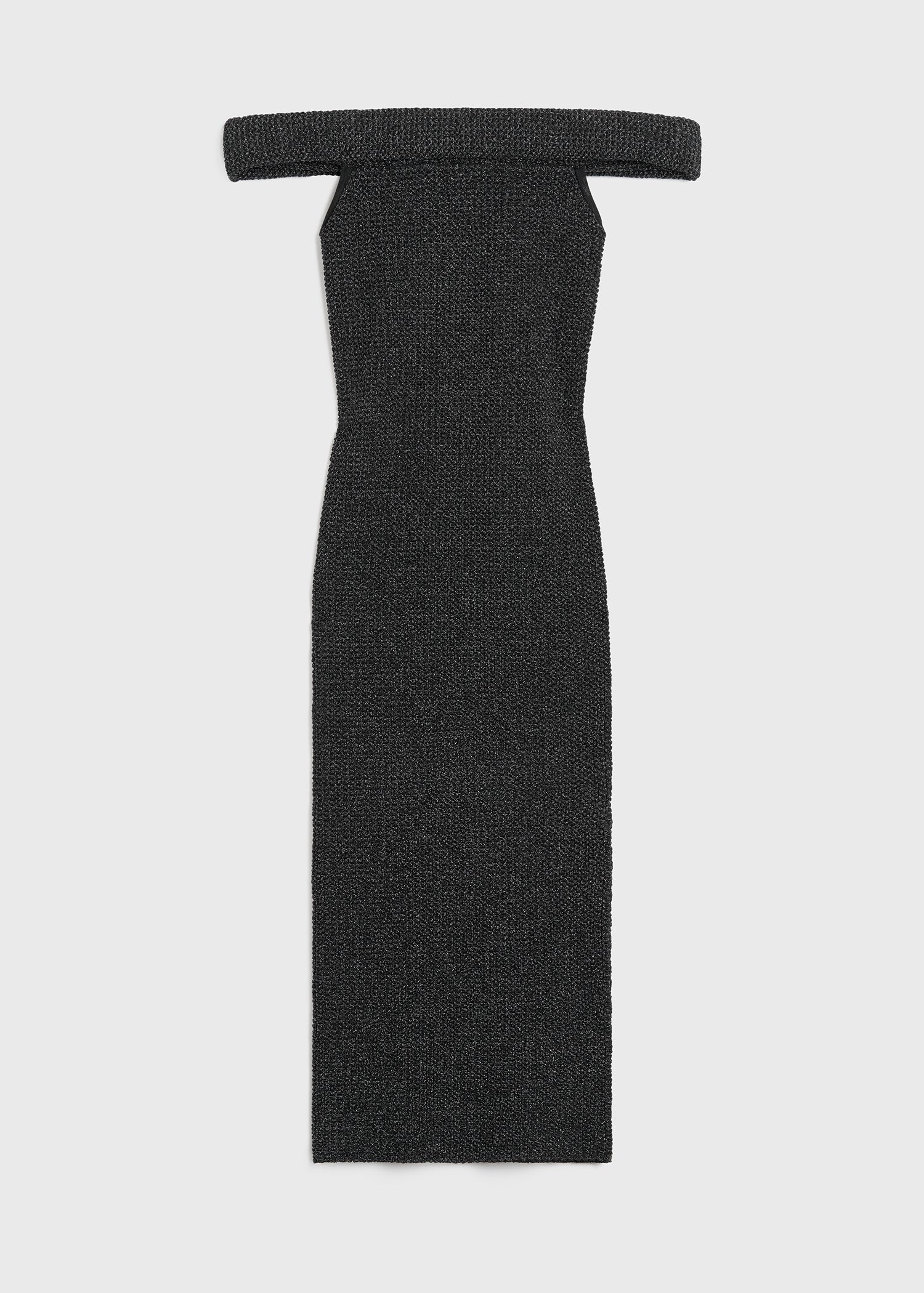 Festive TOTEME dress outlined with an alluring off-the-shoulder neckline that's rolled for volume. It's waffle-knitted from shiny lurex to a tubular slim silhouette that shows just the right amount of skin. Add a pair of heeled sandals to complete an occasion look. Details & Fit - Black - Slip-on - 44% viscose, 31% polyamide, 16% polyester 7% cotton, 2% elastane - Cool hand wash - Style number 241-WRD1179-YA0031 - The model is 175cm/59 tall and wears a size S - True to size, slim fit