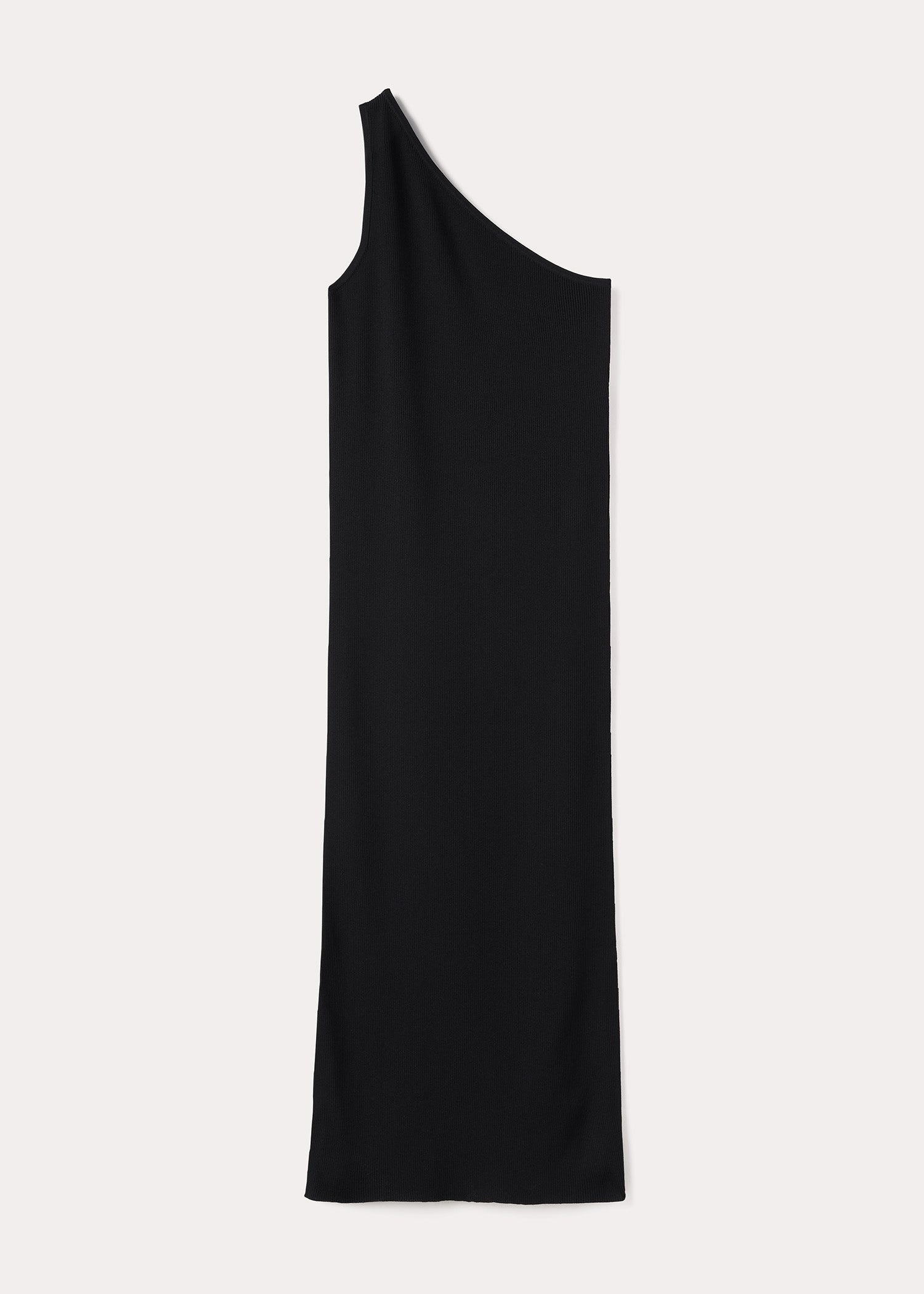 TOTEME dress rib-knitted with an elegant one-shoulder neckline and a slim, midi-length body with a natural silhouette. Wear it from day to evening with sandals and mules. Details & Fit - Black - Slip on - 65% Viscose, 35% Recycled polyamide - Cool hand wash - Style number 233-6042-755 - The model is 176cm/5'9'' tall and wears a size XS - True to size, slim fit