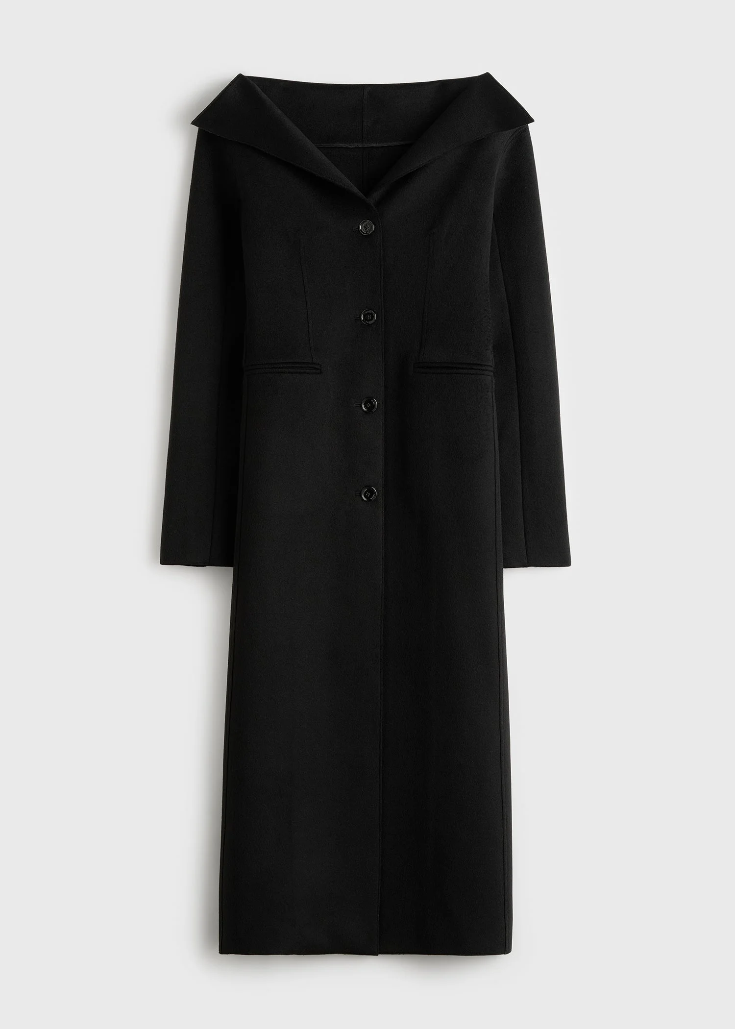 Long coat cut from double-faced wool cashmere with a wide, structured collar that opens elegantly across the shoulders to create a sculptural layer. Unlined for lightness and movement, it falls in a slim, straight silhouette with subtle tailoring details. Details - Black - Welt pockets - 100% RWS wool - Dry clean - Style number 262-WRO0331-FB0006 Fit information - The model is 181cm/5’11” tall and wears a size 36 - Slim, straight fit Origin & Certificates - This product contains Responsible Wool Standard (RWS) certified wool, certified by Control Union, license number 1154443 - Made in China - Manufacturer: Zhejiang Langyi Clothing Co., Ltd - Material woven in China; dyed in China