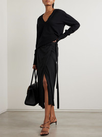 TOTEME's skirt is made from lightweight organic cotton-blend jersey in an effortless wrap design that ties at the waist. It has a straight shape and split hem to reveal a flash of leg. Wear yours with a crisp shirt or cropped top. Size & Fit TOTEME follows its own size guide, please refer to below: - DK 32 = UK 4/ US 0/ IT 36 - DK 34 = UK 6/ US 2/ IT 38 - DK 36 = UK 8/ US 4/ IT 40 - DK 38 = UK 10/ US 6/ IT 42 - DK 40 = UK 12/ US 8/ IT 44 - DK 42 = UK 14/ US 10/ IT 46 - Fits true to size, take your normal size - Midi-length, designed to be worn at the hip - Wraparound design, ties at the waist for an adjustable fit - Lightweight, stretchy fabric - Model is 180cm/ 5'11" and is wearing a DK 36 Model measurements: - Bust: 80cm/ 31.5" - Waist: 65cm/ 25.5" - Hip: 89cm/ 35" Details & Care - Black organic cotton-blend jersey - Ties at side - 72% organic cotton, 28% polyamide