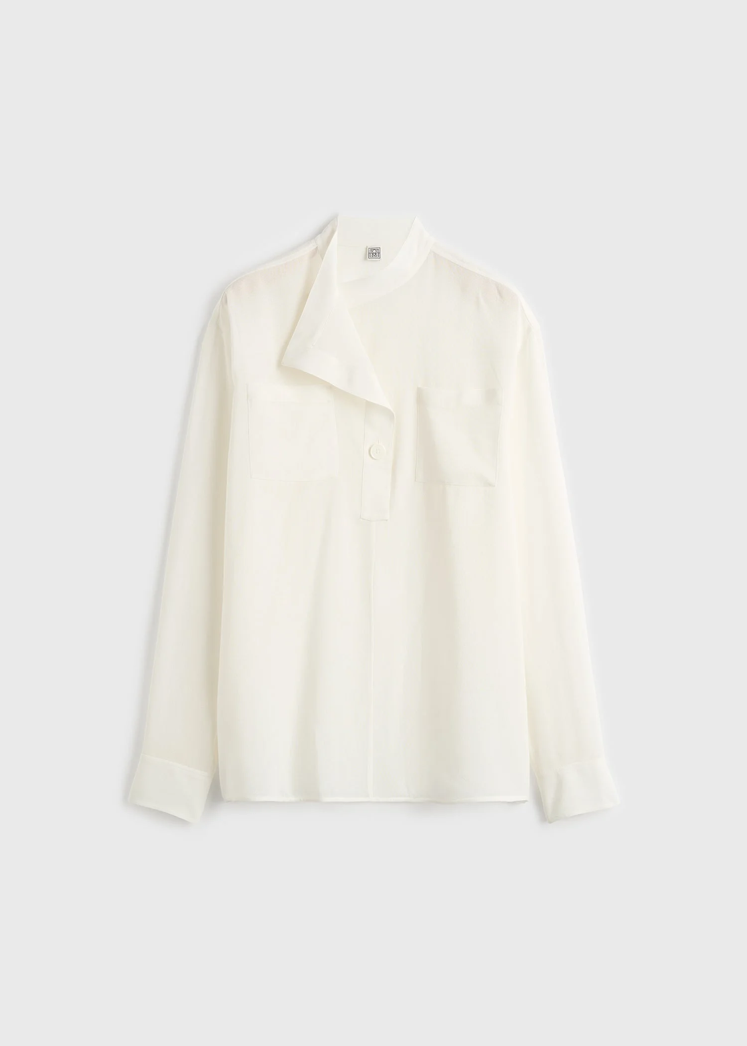 Blouse with an overlapping collar, two flap chest pockets, and a single button that fastens the placket to the neckline, cut from semi-sheer crepe for equal parts structure and drape. Details - Milk - Buttoned cuffs - Patch pockets - Front center seam - 83% viscose, 17% RWS wool - Dry clean - Style number 262-WRT0675-FB0480 Fit information - The model is 180cm/5'11” tall and wears a size 36 - Relaxed fit Origin & Certificates - Made in Portugal - Manufacturer: FSM - Industria De Confeccoes, S.A. - Material woven in Italy; dyed in Italy