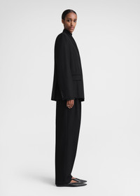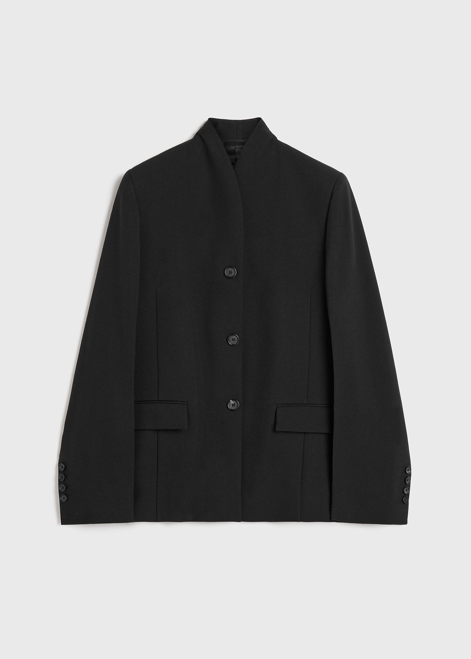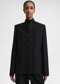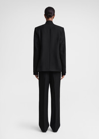 TOTEME suit jacket constructed with a minimalist, overlapped neckline that stands at the nape. It's tailored from a mid-weight fabric to a boxy silhouette with three pockets and buttons at the placket and cuffs, then is fully lined in satin. Wear it with matching trousers to complete a considered occasion look. Details & Fit - Black - Buttoned placket and cuffs - Three pockets, internal pocket - Black satin lining - 78% Viscose, 22% polyester; lining: 100% viscose - Dry clean - Style number 241-WRZ1063-FB0065 - The model is 180cm/5'11" tall and wears a size 36 - True to size, straight fit