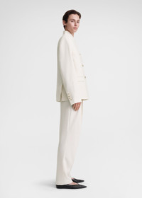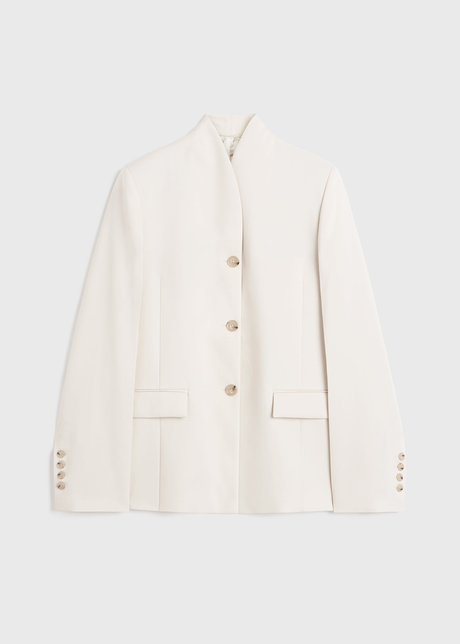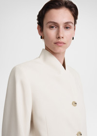 TOTEME suit jacket constructed with a minimalist, overlapped neckline that stands at the nape. It's tailored from a mid-weight fabric to a boxy silhouette with three pockets and buttons at the placket and cuffs, then is fully lined in satin. Wear it with matching trousers to complete a considered occasion look. Details & Fit - Snow - Buttoned placket and cuffs - Three pockets, internal pocket - Black satin lining - 78% Viscose, 22% polyester; lining: 100% viscose - Dry clean - Style number 241-WRZ1063-FB0065 - The model is 180cm/5'11" tall and wears a size 36 - True to size, straight fit