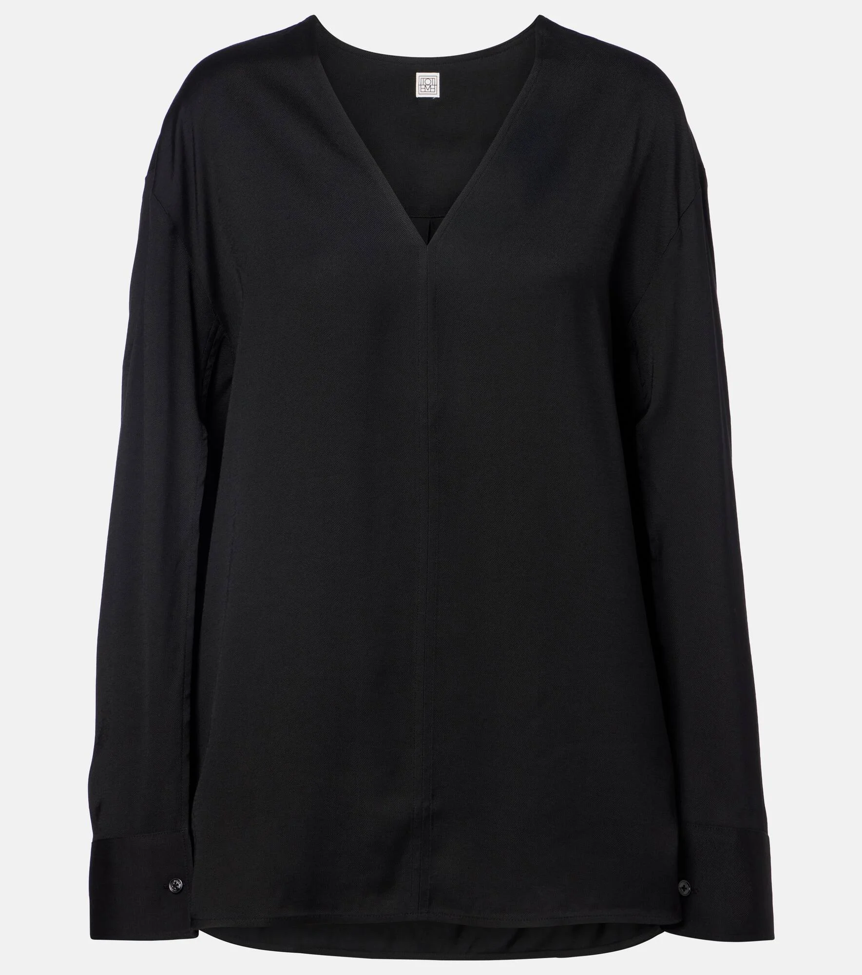 Define your dress code with styles from Toteme, a Stockholm-based brand dedicated to creating a modern uniform. Ideal for relaxed looks, this blouse features an oversized fit with a V-neckline. Product Details - Material: 100% viscose - Care instructions: dry clean - Made in Turkey - Color: black - Designer color name: Black - Cuff: one button - Item number: P01150305 Size & Fit - Fits large to size - we recommend trying one size smaller - Dropped shoulders - Designed for a loose fit - Non-stretchy fabric - Falls below the hip - The model seen in the picture is 178cm-5'10" and wearing a size DE 32