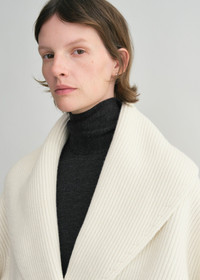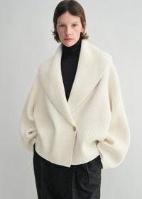 This oversized TOTEME cardigan has curved shawl lapels and wide sleeves with dramatic rounded proportions. It is knitted from a heavyweight, ribbed wool blend and set with a double-breasted front fastened with tonal buttons. Wear it as a sculptural outerwear piece. Details & Fit - Milk - Wide armholes and sleeves - Button front - 85% wool RWS, 15% polyamide - Cool hand wash - Style number 251-WRT4354-YA0110 - The model is 178cm/510 tall and wears a size S - Oversized fit