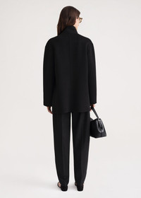 TOTEME jacket woven from light and soft doublé wool, which is certified by the Responsible Wool Standard. It has a boxy silhouette with a stand collar, three patch pockets and an open front. Wear it to stay warm on crisp summer nights. Details and fit - Black - Open front - Three patch pockets - 100% Wool - Dry clean - Style number 232-1036-720 - The model is 179cm/5'9" tall and wears a size 34 - Designed for an oversized fit, go down two sizes if you prefer a neater look