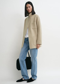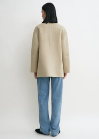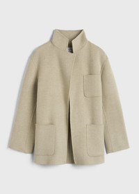 TOTEME jacket woven from light and soft double wool certified by the Responsible Wool Standard. It has a boxy silhouette with a stand collar, three patch pockets and an open front. Wear it to stay warm during crisp summer nights. Details & Fit - Fawn melange - Open front - Three patch pockets - 100% wool - Dry clean - Style number 242-WRO1613-FB0006 - The model is 178cm/510 tall and wears a size 36 - Oversized fit, go down a size if you prefer a neater look