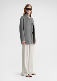 TOTEME jacket woven from light and soft double wool certified by the Responsible Wool Standard. It has a boxy silhouette with a stand collar, three patch pockets and an open front. Wear it to stay warm during crisp summer nights. Details & Fit - Pale grey melange - Open front - Three patch pockets - 100% wool - Dry clean - Style number 242-WRO1613-FB0006 - The model is 177cm/59 tall and wears a size 36 - Oversized fit, go down a size if you prefer a neater look