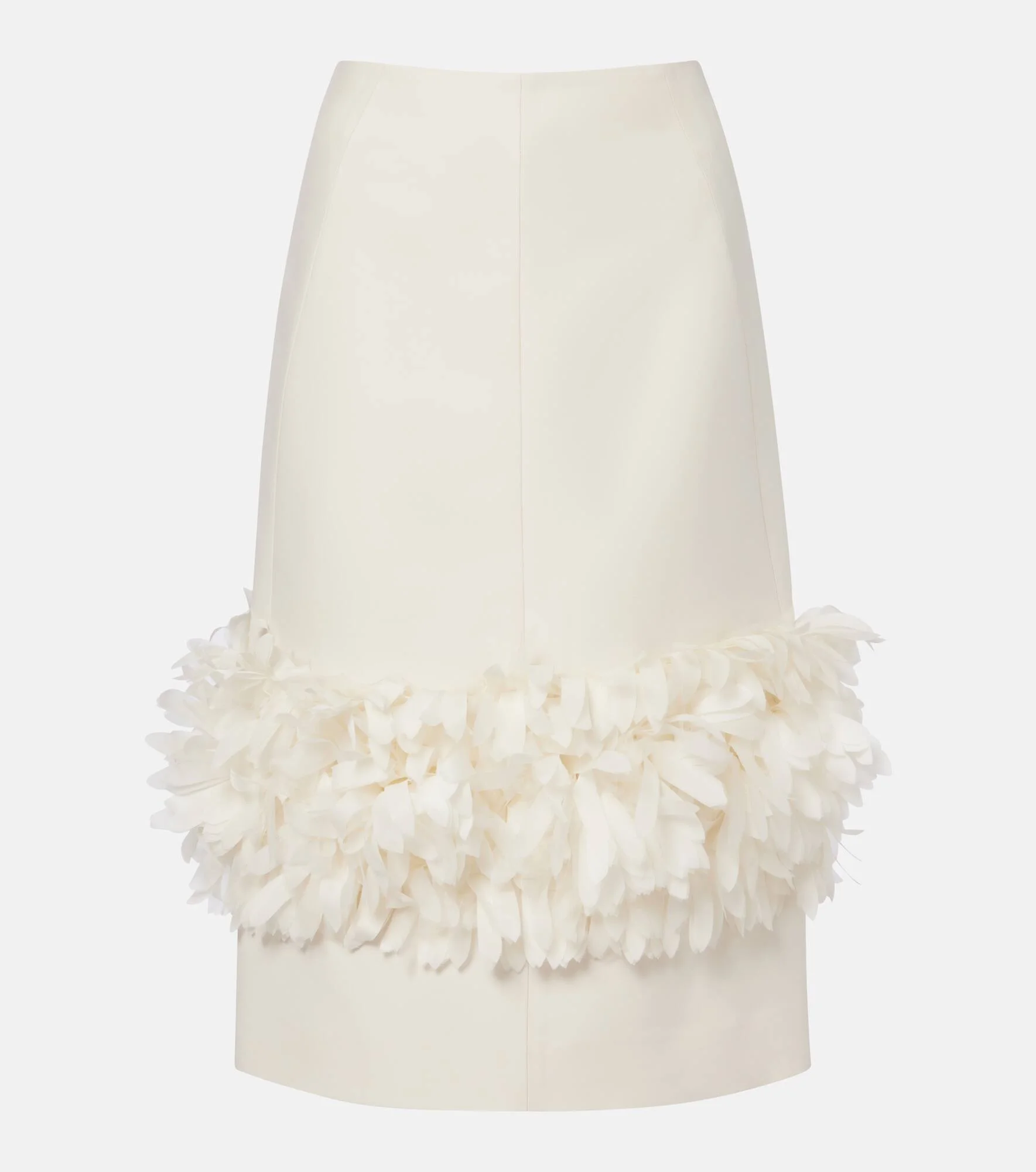 The Petal midi skirt from Toteme features a wide band of silk petals that mimic the gentle movement of feathers. The piece boasts precise darted construction cut from a wool and silk fabric. Product Details - Material: 81% wool, 19% silk - Care instructions: dry clean - Made in China - Color: white - Designer color name: Ecru - Lining: 100% viscose - Trim: 100% silk - Closure: concealed zipped back - Short vent - Item number: P01136648 Size & Fit - True to size - Non-stretchy fabric - slit length 27cm-10.5" - The model seen in the picture is 178cm-5'10" and wearing a size DE 34