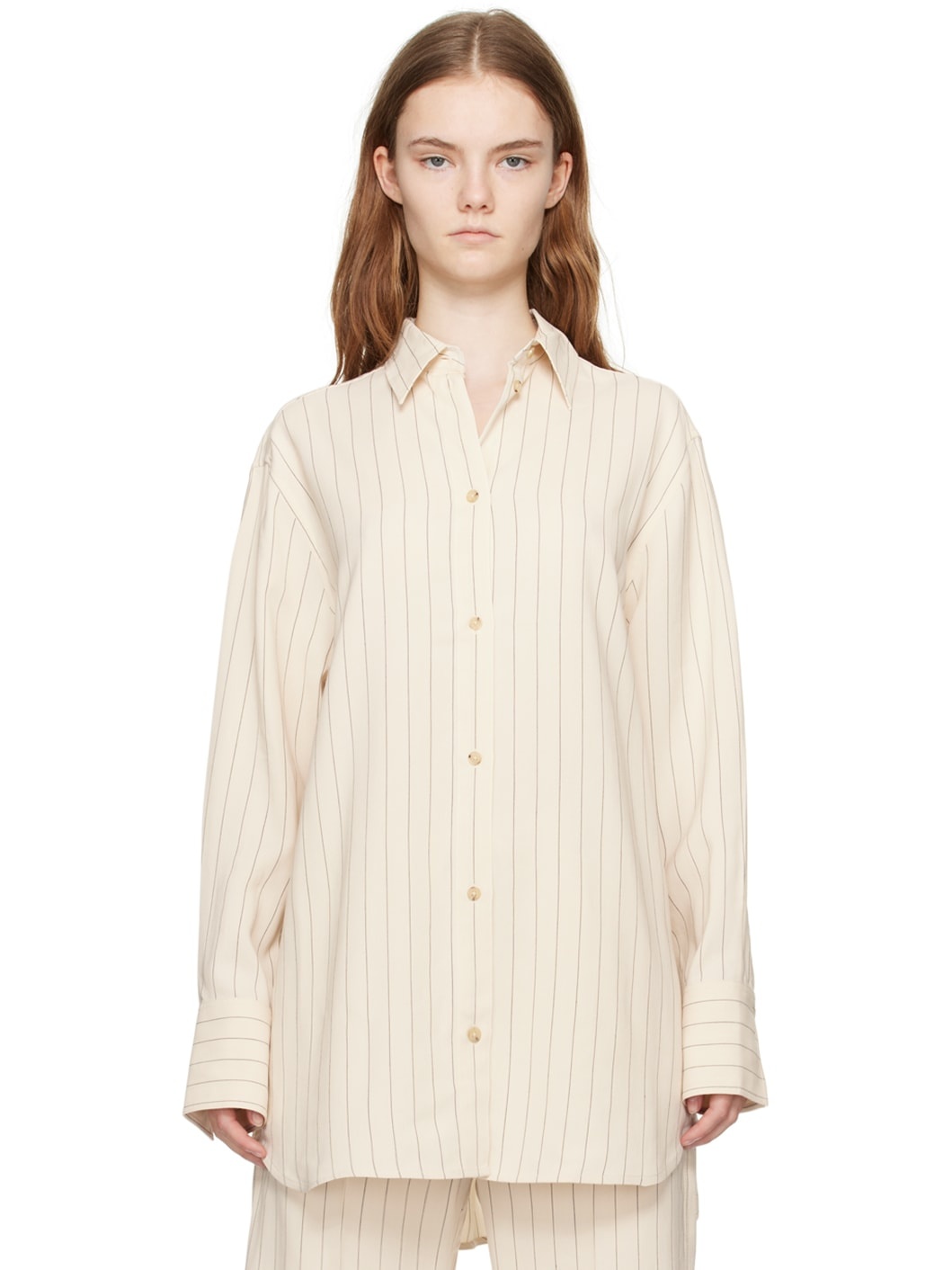 Viscose- and lyocell-blend canvas shirt. Jacquard pinstripes throughout. · Spread collar · Button closure · Dropped shoulders · Single-button barrel cuffs · Box pleat at back yoke · Shirttail hem Supplier color: Ecru/Black