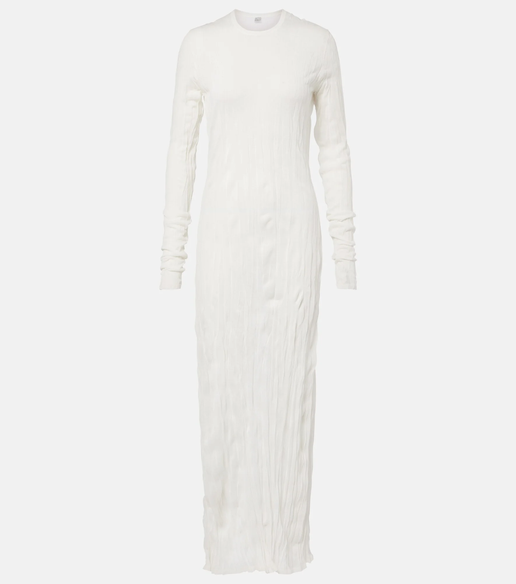Define your dress code with styles from Toteme, a Stockholm-based brand dedicated to creating a modern uniform. This maxi dress showcases a column silhouette, enhanced by all-over pleats with a crinkled finish. Product Details - Material: 75% viscose, 25% polyester (recycled) - Care instructions: hand wash - Made in China - Color: white - Designer color name: White - Item number: P01150288 Size & Fit - True to size - Semi-sheer - Cinched waist - Non-stretchy fabric - The model seen in the picture is 178cm-5'10" and wearing a size XS