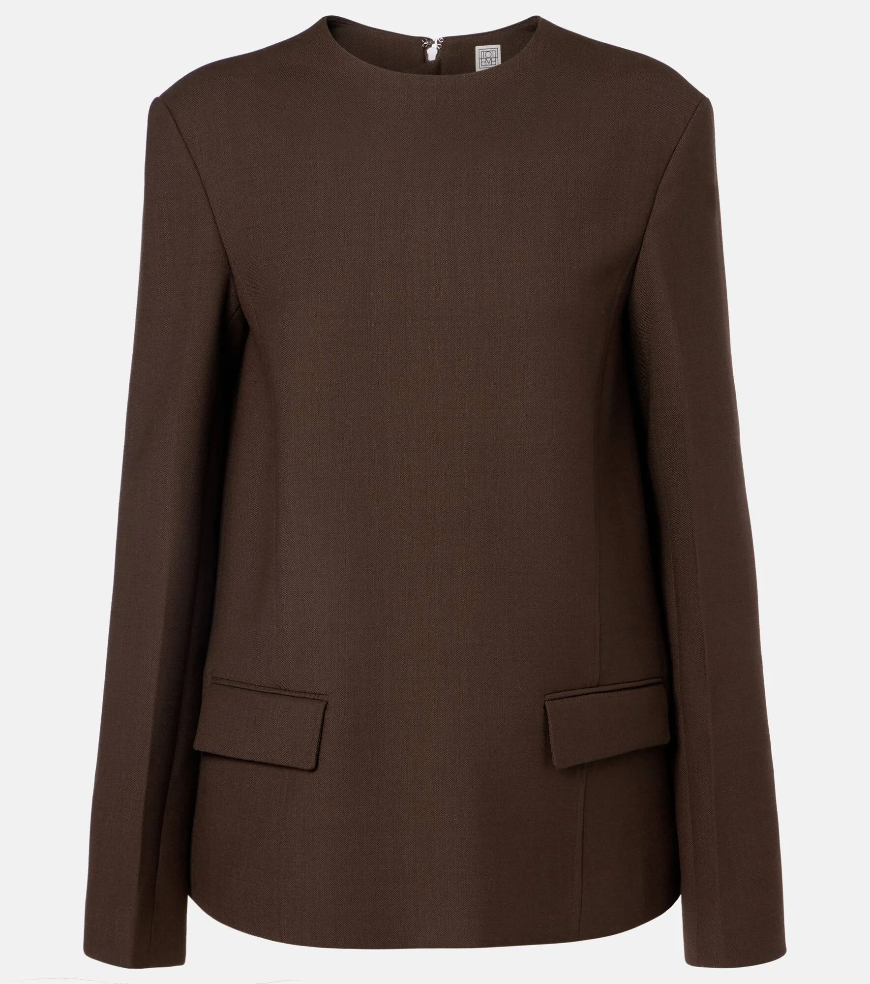 Define your dress code with styles from Toteme, a Stockholm-based brand dedicated to creating a modern uniform. Part of the Pocket line, this structured top is made from crepe and has a chic, polished feel. Product Details - Material: 53% polyester, 43% wool, 4% elastane - Care instructions: dry clean - Made in Portugal - Color: brown - Designer color name: Bark - Closure: concealed zipped back - Pockets: flap pockets - Item number: P01136626 Size & Fit - True to size - Shoulder pad inserts - Designed for a loose fit - Non-stretchy fabric - Falls below the hip - The model seen in the picture is 178cm-5'10" and wearing a size DE 34