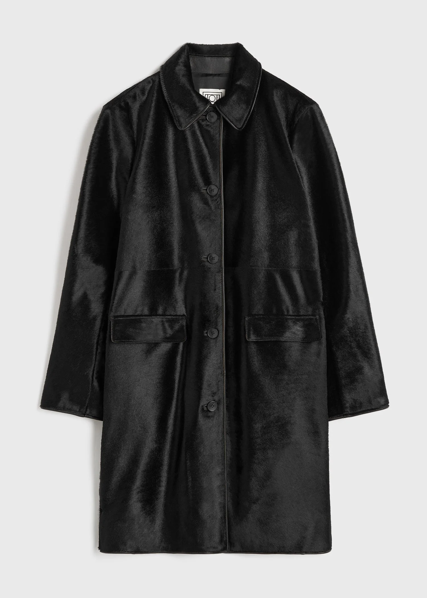 Directional TOTEME coat made from calf leather with a shiny and tactile pony hair effect for an eclectic look. It has a straight silhouette complete with leather piping, satin lining and flap pockets on the sides of the buttoned placket. Wear with anything from jeans to evening dresses. Details & Fit - Black - Button front - Flap pockets - Satin lining - 100% cow leather; lining: 100% viscose - Specialist clean - Style number 251-WRO1812-LE0066 - True to size - The model is 178cm/510 tall and wears a size 36