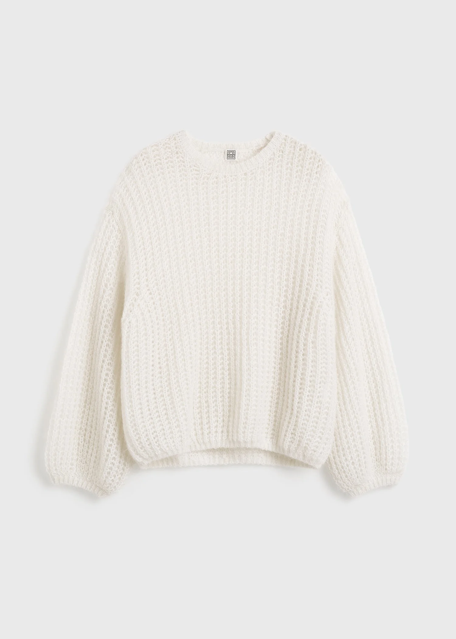 Directional TOTEME sweater knitted by hand to a puffed oversized silhouette. It is made from a light and warm mohair blend with a crew neckline and billowing long sleeves channeling a dramatic mood. Style it over a skirt and sandals. Details & Fit - Off-white - 56% mohair, 30% recycled polyamide, 14% wool - Cool hand wash - Style number 252-WRT0547-YA0160 - The model is 178cm/510 tall and wears a size S - Oversized fit