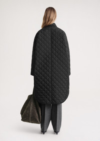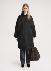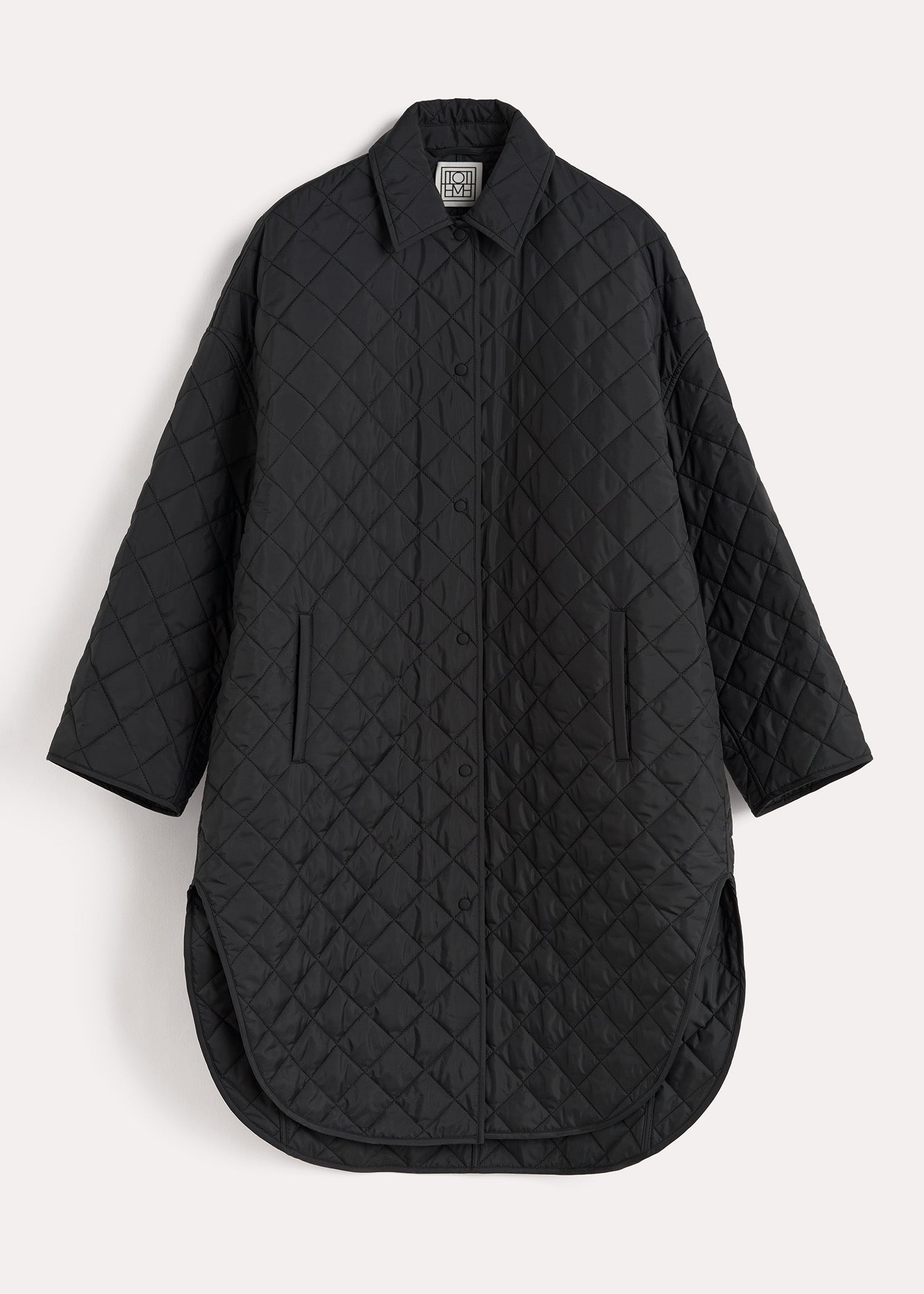 Inspired by TOTEME's quilted jacket, this coat has an architectural cocoon shape with a curved, knee-grazing hem. The crunchy recycled-polyester shell is water-repellent and finished with welt pockets and press buttons that open to a neat interior lined in the same fabric. Layer it over everyday looks. Details & Fit - Black - Press buttons - Welt pockets - Stepped hem - 100% Recycled polyester; lining: 100% recycled polyester; padding: 100% recycled polyester - Dry clean - Style number 234-WRTWOU085-FB0007 - The model is 178cm/510 tall and wears a size XS/S - Designed for an oversized fit, take a size down if you want a neater fit
