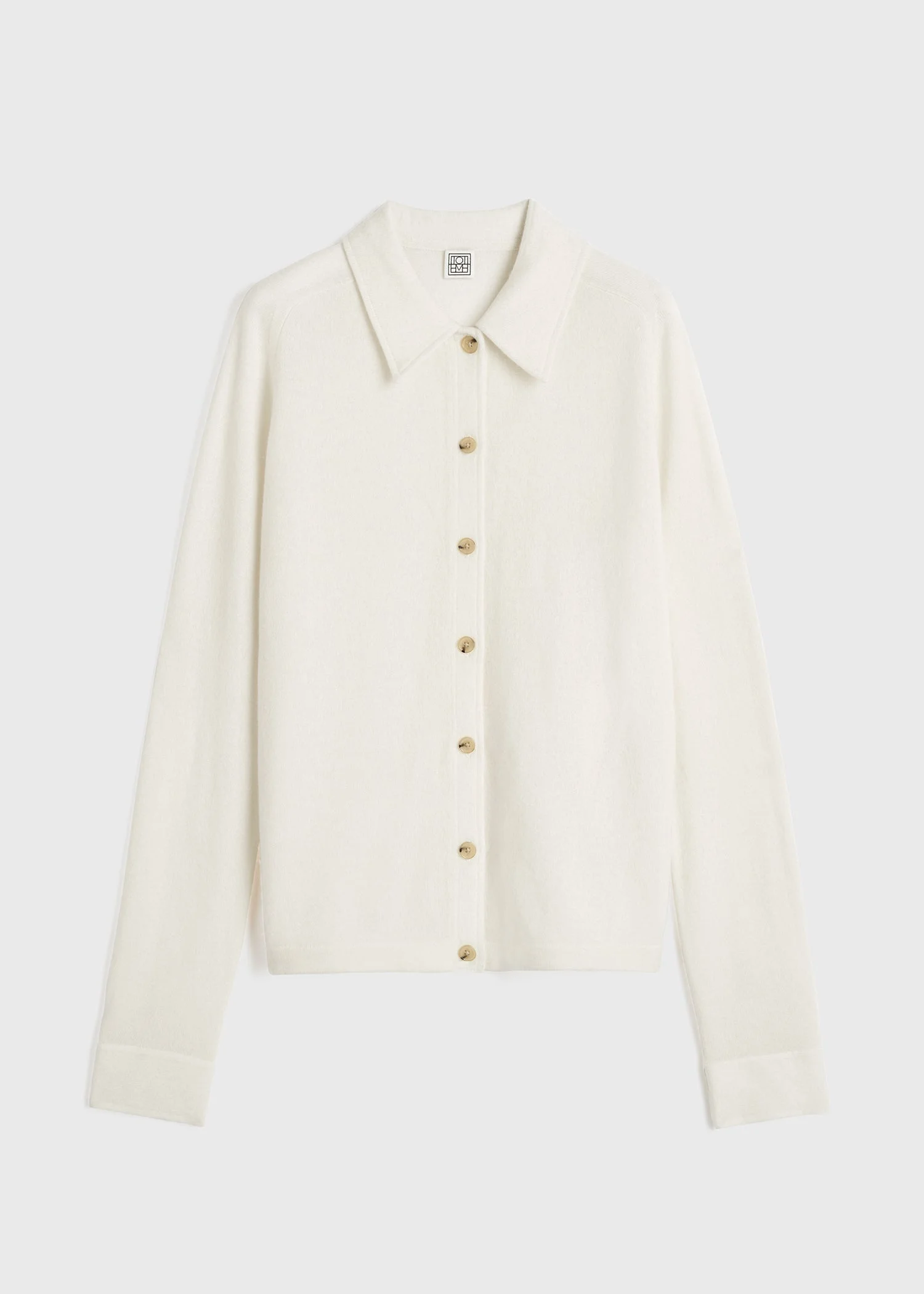 Raglan-sleeved TOTEME cardigan knitted from spongy cashmere for a warm and cozy feeling. It has a point collar and buttoned placket framed by a relaxed silhouette. Wear it with jeans to the movies. Details & Fit - Talc - Buttoned front and cuffs - 100% cashmere - Cool hand wash - Style number 243-WRT0347-YA0016 - The model is 176cm/59 tall and wears a size S - True to size, relaxed fit