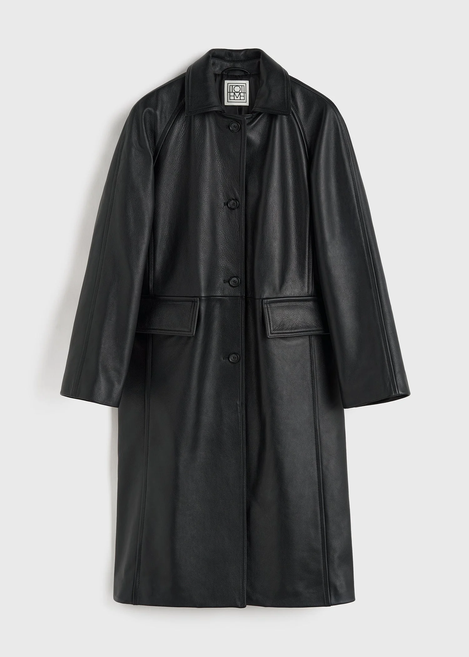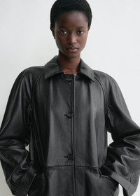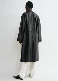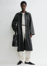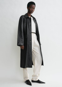 TOTEME coat in heavy grained leather cut to a straight silhouette with raglan sleeves for a modern look. It has flap pockets, a back vent and a button placket that opens to a fully lined interior. Style it with tonal separates to see an exhibition. Details & Fit - Black - Button front - Flap pockets - Black satin lining - 100% Calf leather - Specialist clean - Style number 234-WRTWOU052-LE0007 - The model is 178cm/510 tall and wears a size 36 - True to size, relaxed fit