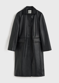 Designer's note: "This coat's raglan sleeve construction is a point of interest — it adds to the overall streamlined, straight silhouette of the piece. We cut it from a heavy grained leather for a grounded, timeless feel, and lined it in soft satin for textural contrast." Details - Black - Button front - Flap pockets - Satin lining - 100% cow leather; lining: 100% viscose - Specialist clean - Style number 254-WRO0280-LE0007 Fit information - The model is 180cm/5'11” tall and wears a size 36 - Straight fit Origin & Certificates - Country of origin: Turkey - Manufacturer: Lider Deri Urunleri San. Ve Tic. A.S