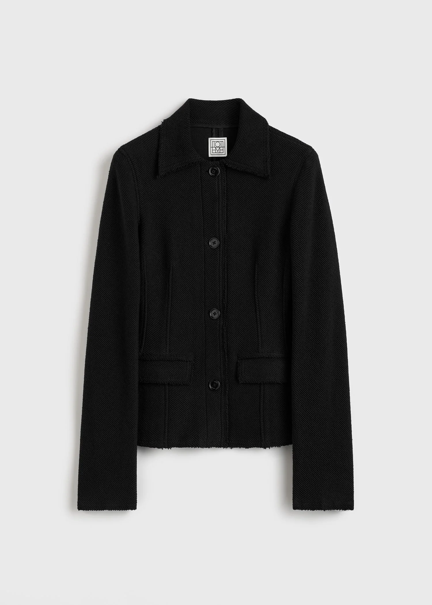 Designer’s note: “This jacket has the sharp structure of tailoring, which we softened by making it from twill jersey. The raw edges add an artisanal, lived-in feel. It’s a piece you can return to again and again, whether you wear it with the matching skirt or with denim.” Details - Black - Fringed cotton twill, jersey reverse - Button front - Flap pockets - Heavyweight twill with jersey base - 100% GOTS cotton - Dry clean - Style number 261-WRO0316-FB0594 Fit information - The model is 180cm/5'11” tall and wears a size 36 - Slim fit Origin & Certificates - Country of origin: Portugal - Manufacturer: Confetil, S.A.