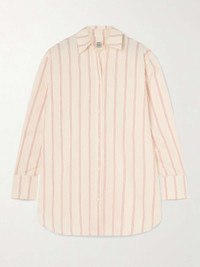 EDITORS'NOTES The tonal-pink stripes on TOTEME’s shirt will instantly uplift any outfit. Tailored in Italy from a cotton and silk-blend, it has a slightly loose shape with a curved hem and fastens with a row of lustrous buttons. Half-tuck yours into high-rise jeans or leave it open over a tank and midi skirt . SIZE & FIT TOTEME follows its own size guide, please refer to below: - DK 32 = UK 4/ US 0/ IT 36 - DK 34 = UK 6/ US 2/ IT 38 - DK 36 = UK 8/ US 4/ IT 40 - DK 38 = UK 10/ US 6/ IT 42 - DK 40 = UK 12/ US 8/ IT 44 - DK 42 = UK 14/ US 10/ IT 46 - Fits true to size, take your normal size - Designed for a slightly loose fit - Mid-weight, non-stretchy fabric - Model is 180cm/ 5'11" and is wearing a DK 34 - Bust: 80cm/ 31.5" - Waist: 67cm/ 26" - Hip: 89cm/ 35" DETAILS & CARE - Ecru and tonal-pink cotton and silk-blend - Button fastenings through front - 54% cotton, 36% recycled cotton, 10% silk - Designer color: Ecru/ Blossom